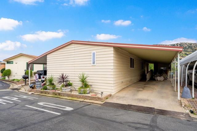 Welcome to Lake Jennings Park Estates, a highly sought-after gated 55+ community just steps from beautiful Lake Jennings, known for its peaceful setting, friendly neighbors, and impeccably maintained grounds. This newer manufactured home, built in 2013, offers 3 bedrooms, 2 full baths, and approximately 1,528 sq ft of bright, open living space on a 3,762 sq ft lot, with no space rent since the land is owned. Inside, enjoy vaulted ceilings, abundant natural light, and a thoughtfully designed floor plan featuring a stunning galley-style kitchen with granite countertops, a large center island, pull-out drawers, walk-in pantry, water filtration system, and a charming dining area accented by canted bay windows. The spacious primary suite includes a walk-in closet, ensuite bath, tray ceilings, and ceiling fan, while two additional well-sized secondary bedrooms provide flexibility for guests, hobbies, or office space. The home also includes a newer washer and dryer, refrigerator, and excellent storage throughout. Outdoor living is enhanced by an inviting front porch, side yard, and backyard with a storage shed, along with mountain-top views that add to the home’s serene feel. An automatic electric chair lift provides added accessibility and convenience, and parking is easy with a covered carport accommodating up to three vehicles. Ideally located close to the clubhouse, residents enjoy resort-style amenities including a pool and spa, clubhouse with full kitchen and fireplace, library, craft center, recreational facilities, and walking paths! All with low HOA fees in a secure, quiet, and welcoming community. This is a rare opportunity to own a newer home with land ownership, views, accessibility features, and an exceptional lifestyle in one of Lakeside’s premier 55+ neighborhoods.