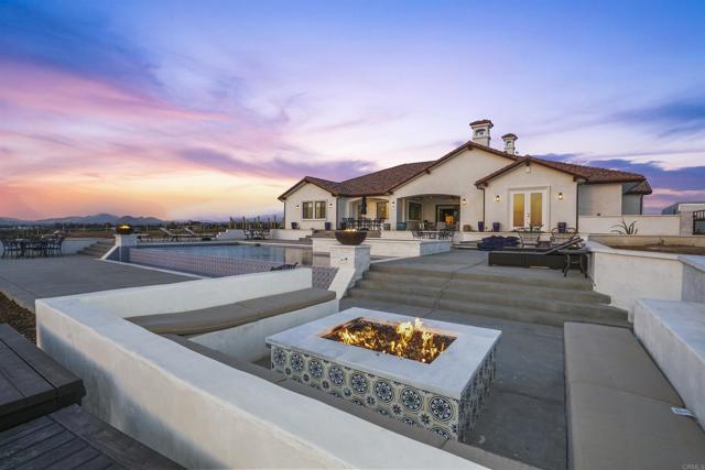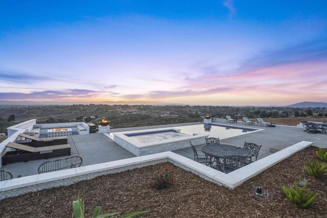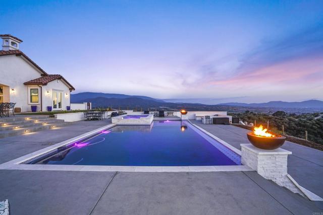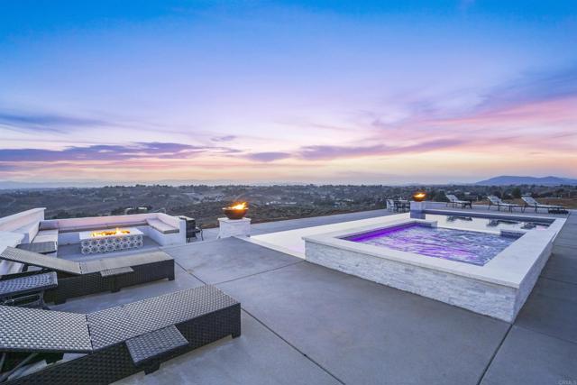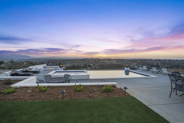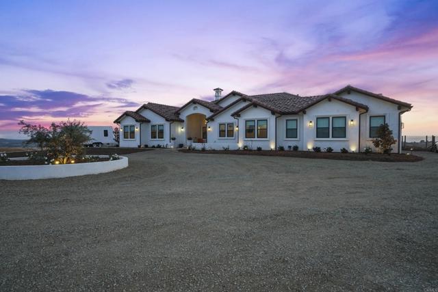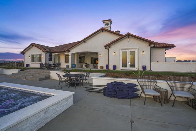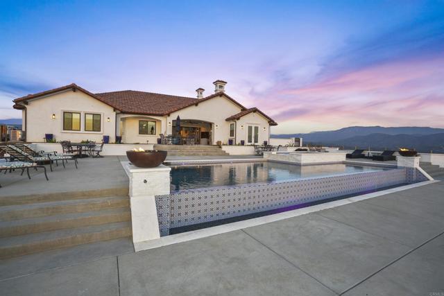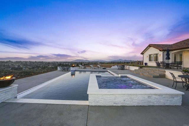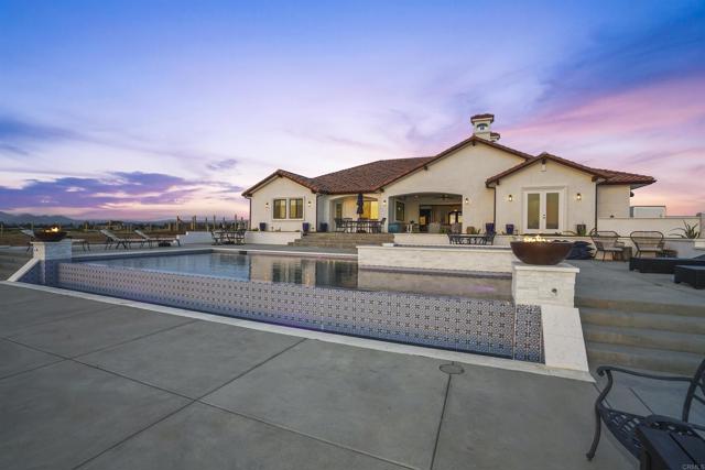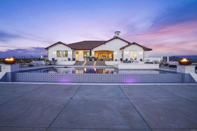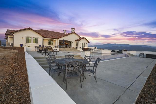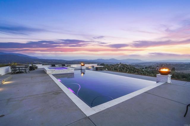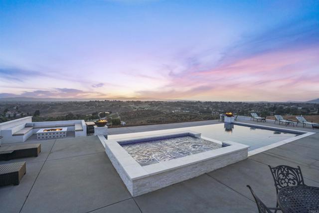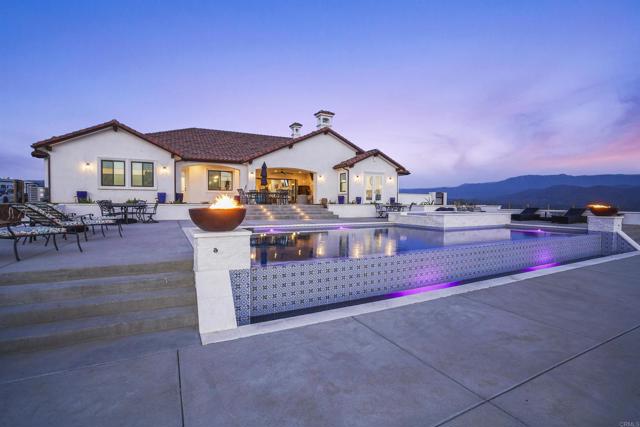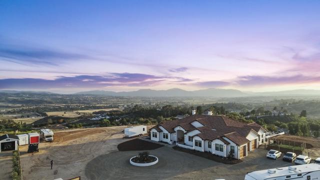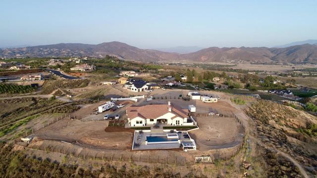 Experience a rare combination of luxury, privacy, and PANORAMIC VIEWS in this gated and gorgeous, nearly brand new and completely custom Temecula Wine Country home. The views from this property cannot be beat! The sun sets at the back of the property every night, hot air balloons are up in the sky every morning and the snow capped mountains are a beautiful sight in the winter. This amazing property boasts 5.05 acres of usable land to add on nearly anything that you can imagine… a guest house, horses, vineyards, dirt bike track… the sky is the limit with this property! This house has many upscale amenities including a 4k home theater with a 135 inch Stuart screen, 8 power-reclining stadium seats, a custom glass wine cellar for the wine lovers, gorgeous crown moulding and woodwork throughout, a mother-in-law suite with its own front entrance, bath, family room and kitchenette, a gourmet kitchen with a 60” range, two dishwashers, built-in espresso machine and so much more. The three car garage has two EV charge ready ports inside and outside the garage is plenty of parking for RVs with two sets of full hook ups. The large “la cantina” doors open up to bring the outdoors into the house. Once you step outside you will fall in love with the backyard. The back patio has a built in gas fireplace and two built-in infrared heaters to relax in comfort all year long. The backyard offers a beautiful infinity pool with an oversized spa, fire bowls and a large gas fire pit with built with seating. All of this is surrounded by amazing panoramic views of Temecula and gorgeous sunsets every night! The seller has approved permits for a 40 foot long cabana with fireplace and outdoor kitchen/BBQ. NO HOA or Melo Roos. For buyers in search of a luxurious retreat with exceptional build quality and plenty of space to make your own, this maybe the best opportunity seen in wine country in many years.