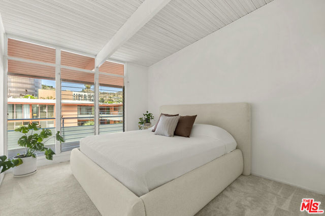 The iconic Hollywood Riviera is a celebrated West Hollywood landmark, designed in 1954 and embodying the quintessential mid-century Los Angeles aesthetic. Featured in publications such as Dwell and Architect Magazine, the building holds a coveted Mills Act historic designation, offering substantial property tax savings for its next owner. A recently completed renovation included earthquake retrofitting and a meticulous restoration of the common areas, returning the property to its original splendor. Residents now enjoy a resort-style pool with an expansive deck framed by lush tropical landscaping. This south-facing, upper-level residence showcases dramatic architectural elements, including vaulted ceilings, exposed beams, and floor-to-ceiling windows that bathe the interiors in natural light. Thoughtfully updated, the home blends authentic character with refined modern finishes. The kitchen is appointed with all-new custom cabinetry and appliances, Taj Mahal quartzite countertops, and clerestory windows. A renovated bathroom features a soaking tub, contemporary vanity, illuminated medicine cabinet, and upgraded plumbing. Additional highlights include a newer HVAC system, generous in-unit storage, and a private balcony spanning the length of the residence. Secure, automated gated entry provides two covered parking space, a rare amenity in the neighborhood, along with additional garage storage. The building also offers on-site laundry, controlled access, and earthquake insurance. Steeped in Hollywood history and often seen in film, television, and commercial productions, the Riviera remains one of West Hollywood's most enduring architectural treasures. Perfectly situated moments from the Sunset Strip's world-class dining, shopping, and nightlife, this residence offers the ultimate expression of California living.