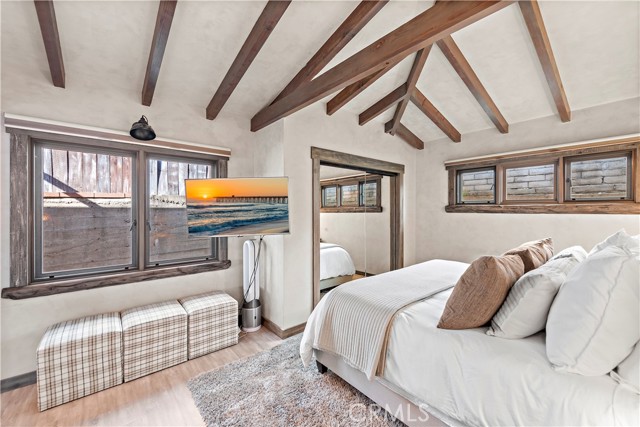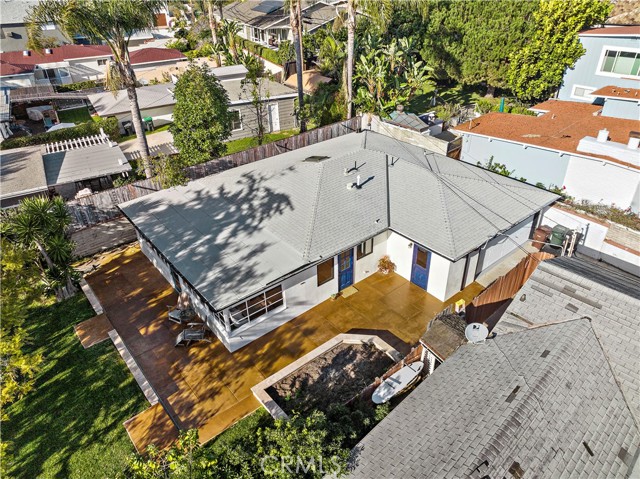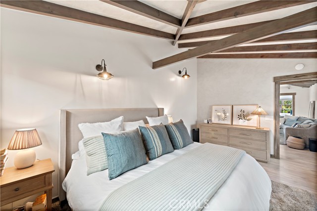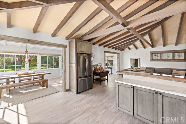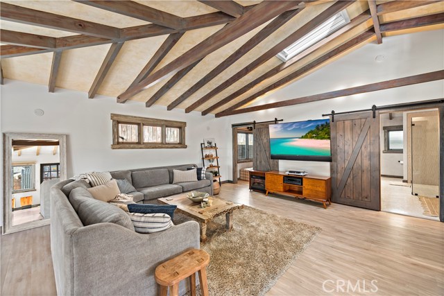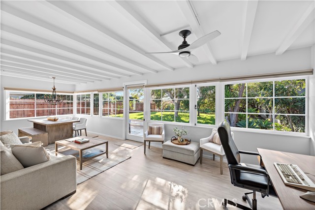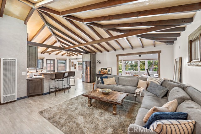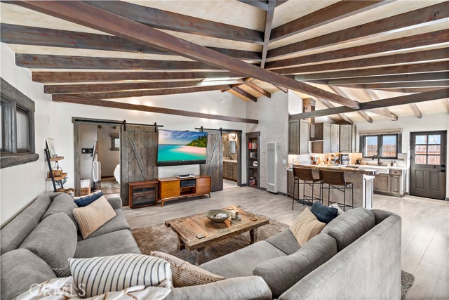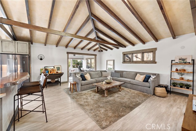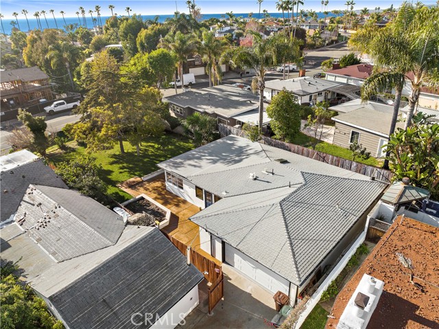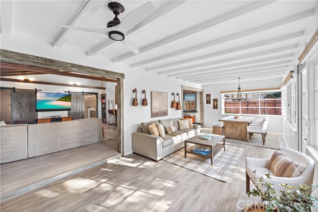 Welcome to this unique opportunity, nestled on a spacious lot just a short stroll from T-Street Beach, this single story home welcomes you with an airy open-concept layout that invites an abundance of natural light with a large private yard engulfed with mature trees and landscape. A blend of modern design and rustic charm creates a warm and inviting atmosphere throughout. Inside, you'll find wide-plank luxury vinyl flooring, vaulted beamed ceilings, wood-cased windows, oversized barn doors, and an open concept sunroom that leads to the outdoor living areas, patio and yard. The kitchen is equipped with custom cabinetry, a large single-basin sink, high-end LG stainless steel appliances, and a peninsula with seating. The primary bedroom and bathroom offer a luxurious retreat with a quartz-topped dual vanity, a generously sized wood-framed mirror, a stylish frameless walk-in shower with patterned tile, and ample linen storage. Outside, the property features a spacious lawn for entertaining, relaxing, sunbathing or just to stroll around, a concrete patio with a built-in planters, and multiple areas for activities. Walk-through you secret bookshelf door onto the attached two-car garage with ample storage cabinets, a convenient laundry area, and updated plumbing and electrical systems throughout. This is your opportunity to walk to the beach, and explore what San Clemente has to offer. Conveniently located to Shops, Dinning, and Stores and easy for commuting.