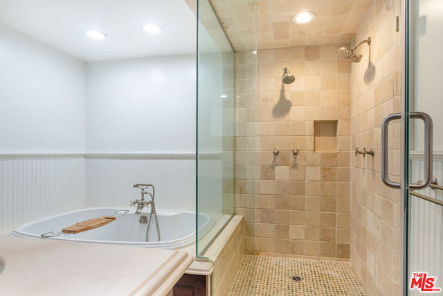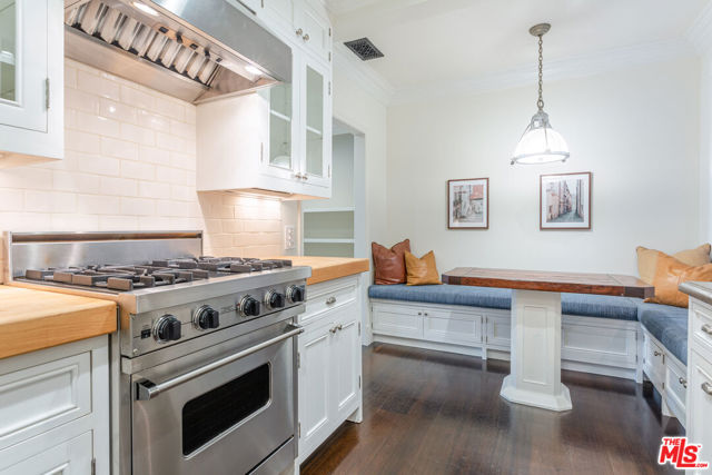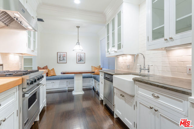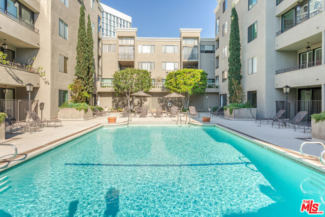 Welcome to this elegant, traditional-style condo nestled in one of West Hollywood's most coveted neighborhoods. Quietly positioned on the peaceful side of the building, this spacious residence showcases premium hardwood floors, intricate crown moldings, and custom built-in cabinetry throughout. The stunning eat-in kitchen is a chef's delight, featuring a cozy breakfast nook, Sub-Zero refrigerator, and top-of-the-line Viking appliances. A gracious formal entry leads to both a sophisticated dining room and a bright, inviting living room with French doors that open to a private terrace ideal for enjoying morning coffee or unwinding in the evening. The luxurious primary suite offers a generous walk-in closet and a spa-like bathroom, creating a true retreat. The second bedroom, currently configured as a den, provides flexible use as a guest room or home office, and also opens to the terrace through elegant French doors. Residents also enjoy access to the building's beautifully maintained amenities, including a private gym, sparkling pool & Spa's.