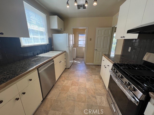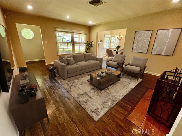 Immaculate, Spacious and Charming. A true place to call home this 3 bedroom and 2 bath will satisfy every need. The inviting entry opens to a large living room with natural light and a cozy brick fireplace. A galley kitchen with new flooring, granite counters, travertine trim and glass tile backsplash includes a new 4-burner stove and grill with huge oven and vent, a new Bosch dishwasher and a conveniently located laundry area with stacked washer and dryer. A large dining area adjacent to the kitchen spotlights a beautiful chandelier and wainscoting..perfect for formal or casual entertaining. Two large, bright bedrooms and one bath are accessed by a central hall. An additional spacious bedroom with its own bath and slider to patio/yard access can double as an office or family room. Additional amenities include central air and heat, Newer Milgard Windows, window treatments, custom paint, newly glazed hardwood flooring, gated access to the garage and spacious rear yard. A beautiful and centrally located home close to markets, shopping and transportation. A must see!!