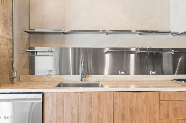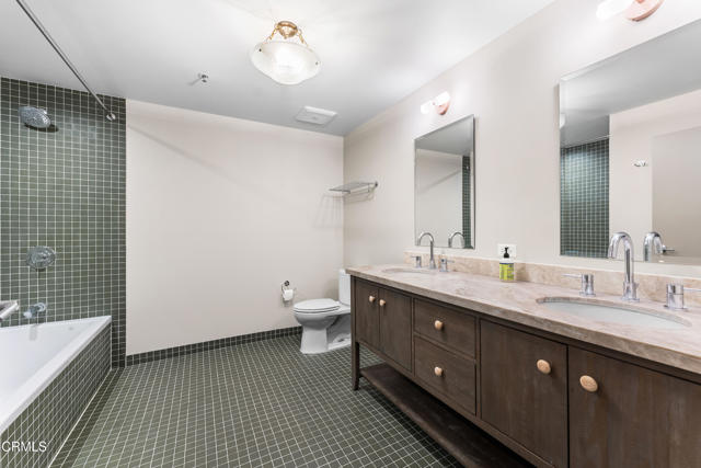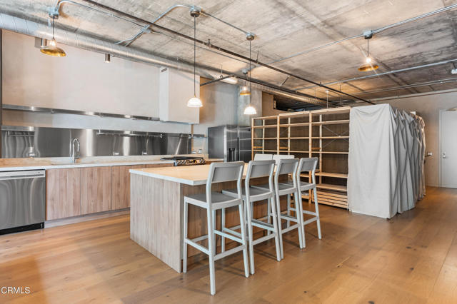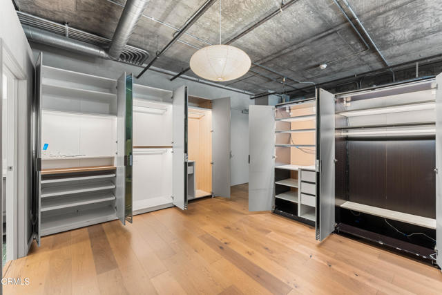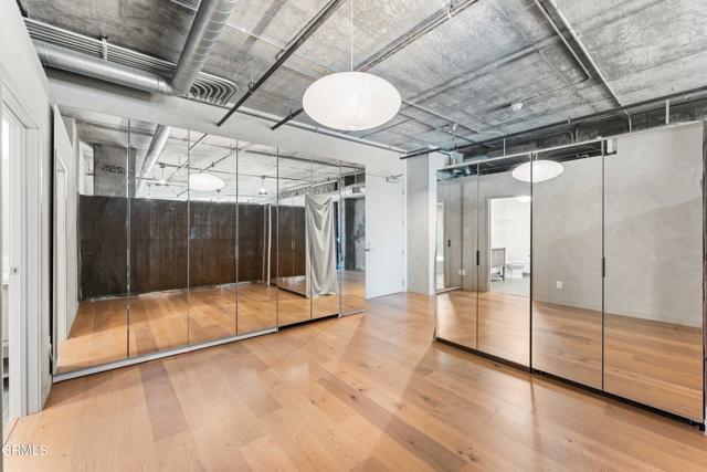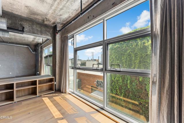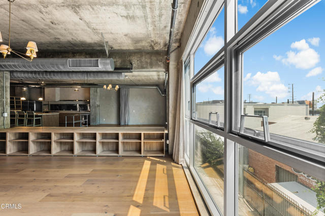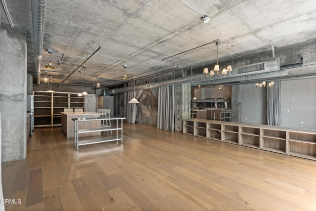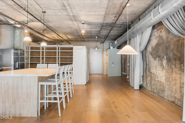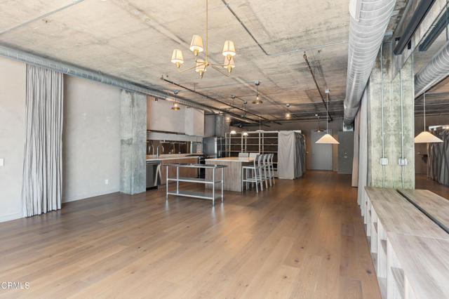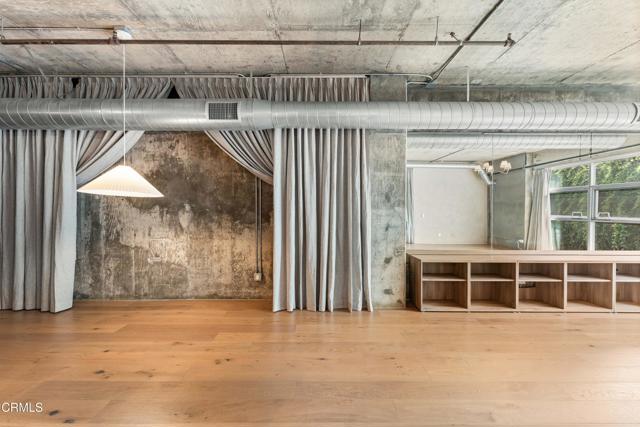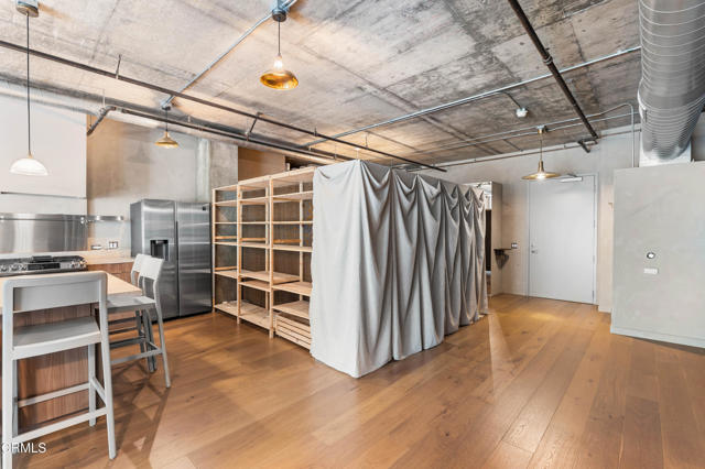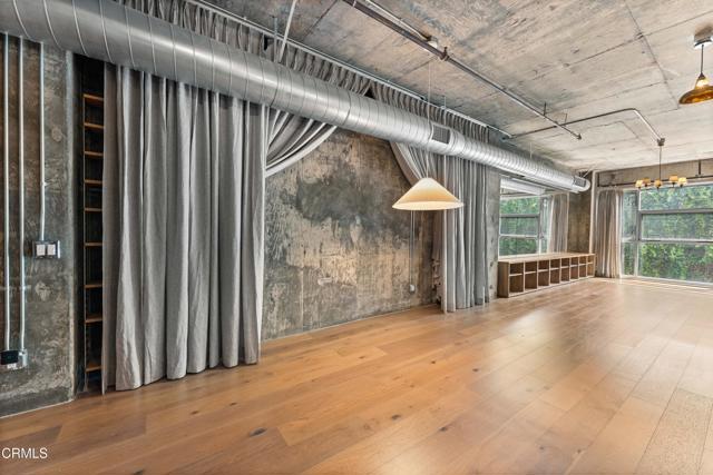 Step into this stunning industrial loft with new flooring and a wide, open floor plan featuring soaring ceilings, concrete floors, exposed pipes, and floor-to-ceiling double-pane windows that fill the space with morning light. Portola limewash walls, a wall-to-wall mirror, and custom linen curtains (smart-home ready) add warmth and style. The updated kitchen features stainless shelving, backsplash, and a large Taj Mahal quartzite island, perfect for entertaining. Designer fixtures by Klint, Noguchi, and Josef Frank complement the smart lighting system, creating flexible ambiance. The tucked-away bedroom area is divided by wardrobes with integrated lighting for privacy and function. A spacious bath offers an oversized soaking tub, double vanity, new shower tile, and Moen fixtures for a spa-like feel. Additional features include a Nest thermostat, Samsung washer/dryer, and discreet projector screen for movie nights. Enjoy a resort-style rooftop with pool, spa, fire pits, cabanas, BBQ, and gym for luxurious urban living in the Arts District, plus gated parking and 24/7 security.