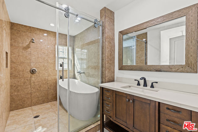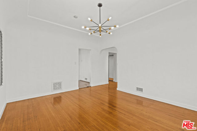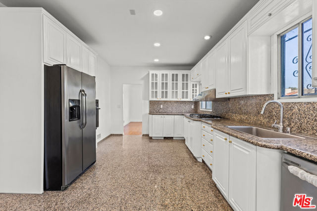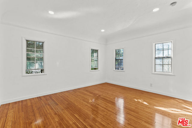 BEAUTIFULLY REMODELED SPANISH LOWER UNIT IN BEVERLY GROVE. This spacious lower unit offers the perfect blend of character details and stylish modern upgrades. Enter from the front porch into a light and bright grand living room with high ceiling and decorative fireplace. There is a formal dining room adjoining an expansive, updated kitchen with stainless steel appliances, including washer and dryer, granite counters and rear entrance. A hallway opens to three generous bedrooms, one with a fully remodeled en suite bath, and a stunning, redesigned primary bath with extra-large shower and modern soaking tub. Additional features include beautiful period details, hardwood floors, recessed lighting, central AC, tankless water heater, ample closet space and a garage spot. This amazing home is ideally located just steps from Third Street, the Grove and Beverly Center.