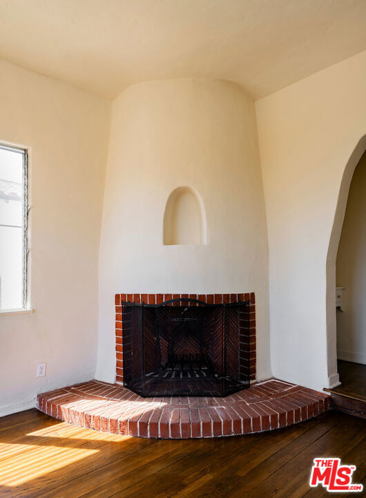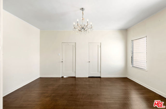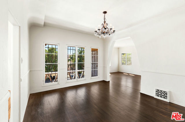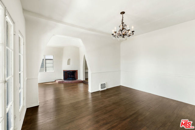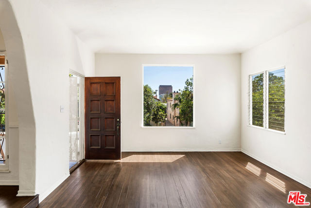 BEAUTIFUL CHARACTER-RICH UPPER UNIT IN BEVERLY GROVE. This light and bright upper Spanish duplex unit offers charming period details throughout. The living room features a decorative fireplace, picture window and vaulted ceiling. A formal dining room adjoins a galley kitchen with a rotunda breakfast room, a separate laundry room with washer and dryer and a convenient rear entrance. There are two generous bedrooms and two baths, with the primary bath including a separate tub and shower. Additional features include hardwood floors throughout, a large front covered private patio, central AC, ample closet and storage space. Don't miss this ideally located wonderful home!