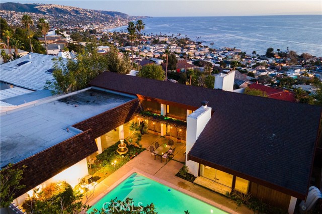 Now available again and priced reduced for immediate booking! Awe-inspiring, panoramic Coastline, Catalina Island, and City light views from this gated Mid-Century Modern home. Featuring a Private Interior courtyard patio with a huge (in-ground) pool surrounded by lush landscaping and a serene fountain. The open floor plan has walls of windows to the expansive ocean views, and a wrap-around patio/deck to lounge or dine alfresco. Living Room has high-beamed ceilings, a large fireplace, and multiple seating areas from which you can enjoy sunrises over the sweeping Coastline to the south, and golden sunsets over Catalina Island to the north. Amazing. Remodeled kitchen and bathrooms, beautiful wood floors, and Spanish tiles throughout. Most rooms feature floor-to-ceiling windows and glass doors that access the courtyard or 180-degree oceanview deck. Four spacious bedrooms (three with panoramic views, one with pool/patio view) and a den/family room with a fireplace (with a sofa that converts to a queen bed) offer ample space to enjoy the indoor/outdoor California lifestyle. Sleeping Accommodations for 10 people. The main floor primary bedroom suite has floor-to-ceiling windows overlooking Laguna Village, yet is completely private. The two bedrooms on the lower level are separated by the family room, all have ocean views. All rooms have sliders to allow in cool ocean breezes, and there is a Portable a/c unit for the few days a year it might be needed. Enjoy secluded sunbathing by the pool or wander down to Crescent Bay Beach and Village shops/restaurants - all just blocks away. Rates and terms are negotiable - available for long and short-term rentals (of 30+ days). Prices adjust according to term and season (long-term/off-season rates as posted, summer months are higher). Inquire.