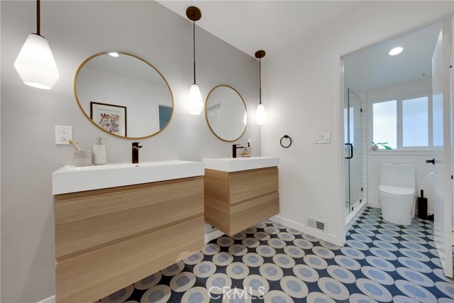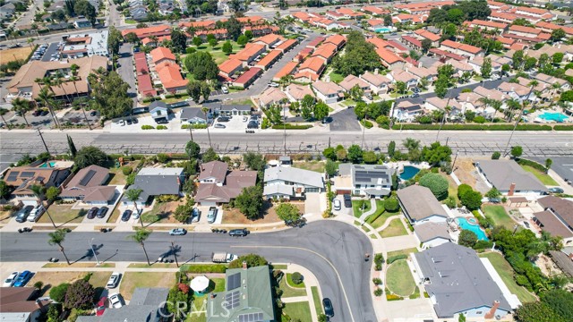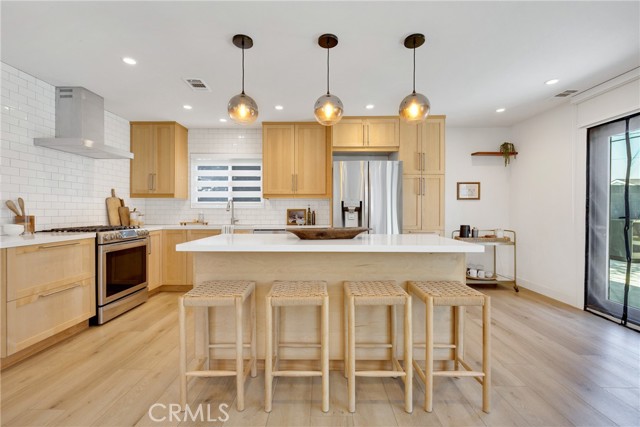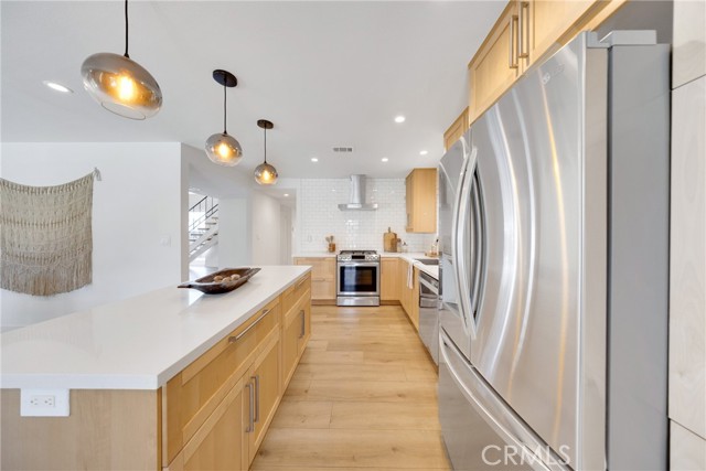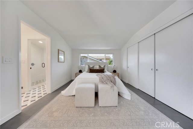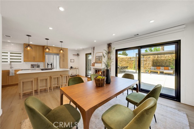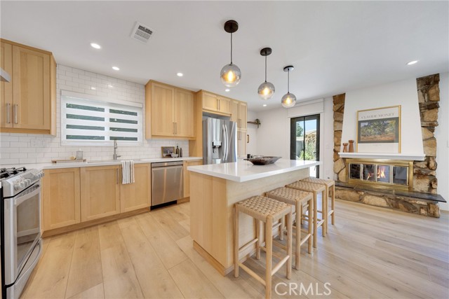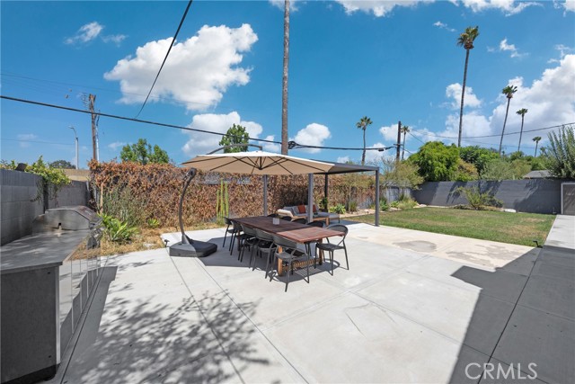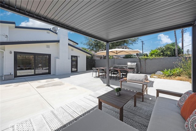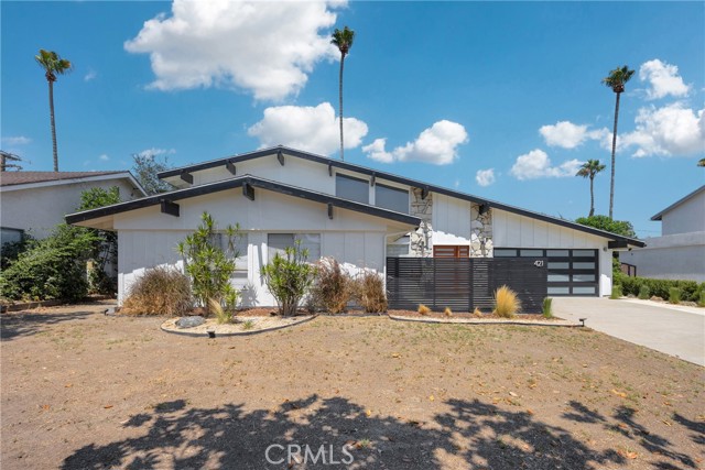 Welcome to 421 Larry Lane, a charming mid-century modern home nestled in the highly sought-after city of Placentia! This beautifully updated 3 bedroom, 2 bath residence features high vaulted ceilings and oversized windows that fill the home with natural light, creating a spacious, clean, and functional living space. The expansive living room flows effortlessly into the updated kitchen and dining area, perfect for everyday living and entertaining. The kitchen is sleek and modern, showcasing a subway tile backsplash, quartz countertops, new stainless steel appliances, and a generous eat-in island with ample space for cooking and gathering. The cozy dining room features a warm fireplace and newer sliding glass doors that open to a large backyard oasis complete with a built-in BBQ and a stylish new pergola, ideal for outdoor entertaining. Downstairs, the two spacious bedrooms offer custom built-in closet shelving and easy access to the tastefully remodeled hall bathroom, conveniently located near the kitchen and dining areas. Upstairs, the private primary suite provides a peaceful retreat with its own updated en-suite bathroom, designed with simplicity and modern elegance. Additional upgrades include new SPC plank flooring throughout the downstairs, fresh interior and exterior paint, a sleek gated front patio, and added concrete in both the front driveway and backyard for extra functionality. The attached 2-car garage is equipped with A/C and built-in storage, making it perfect for a home office or gym setup. Included in the sale are a new washer/dryer, refrigerator, and a smart Nest Yale lock for convenient keyless entry. Located near top-rated Placentia-Yorba Linda Unified schools, parks, shopping, and dining, this well-maintained home offers the perfect blend of comfort, style, and convenience