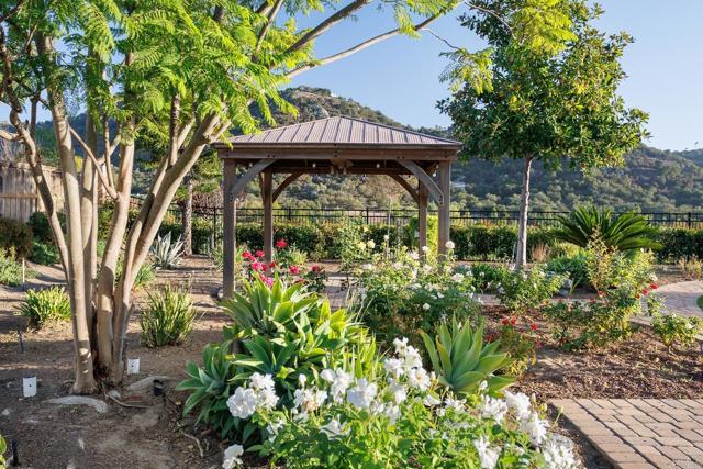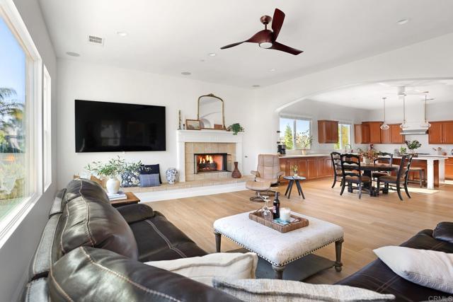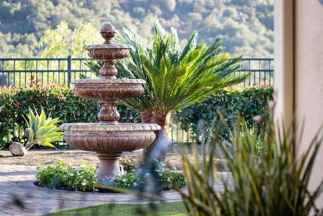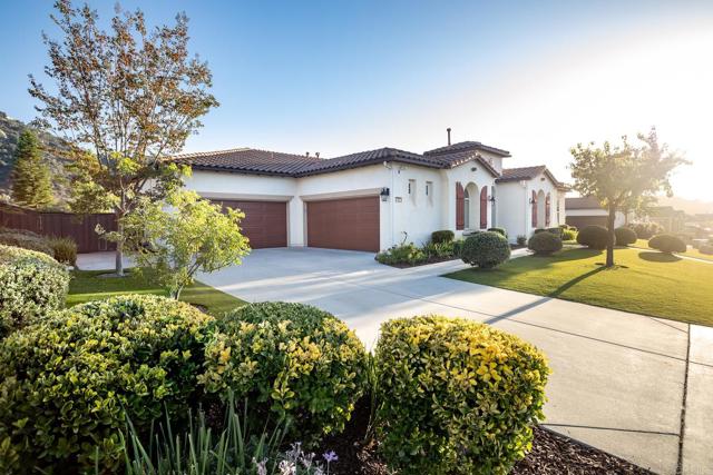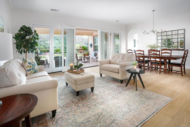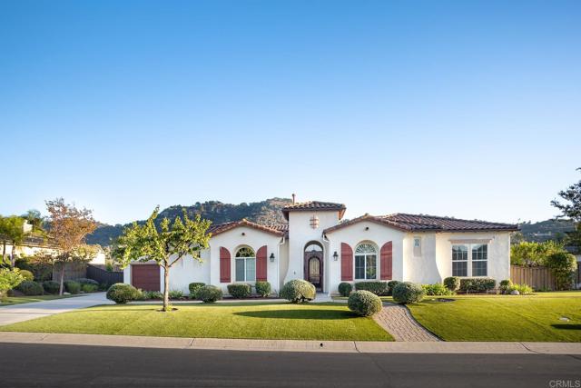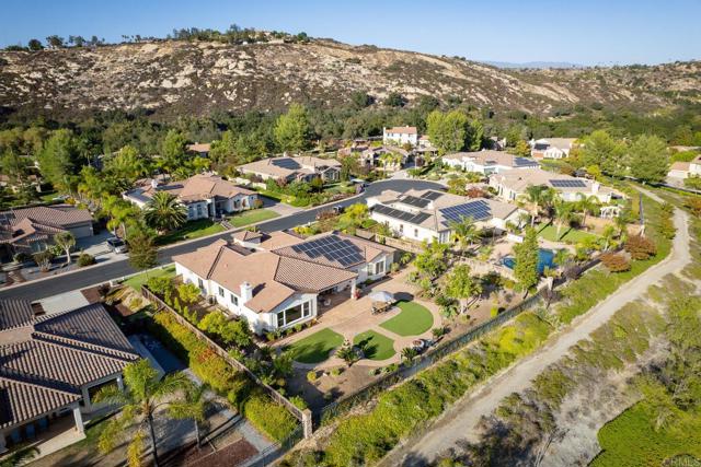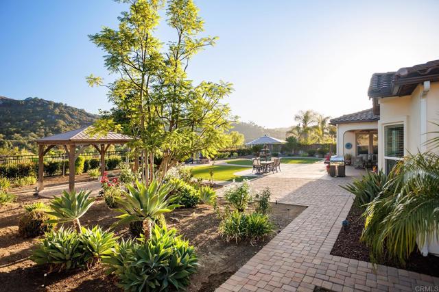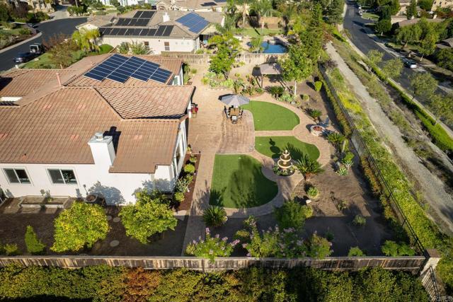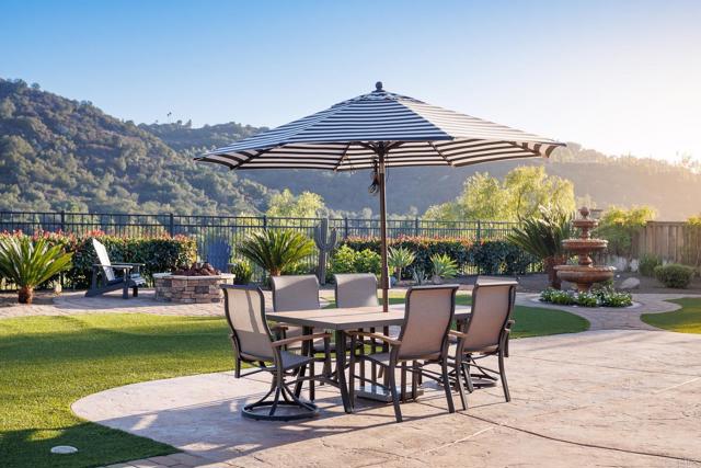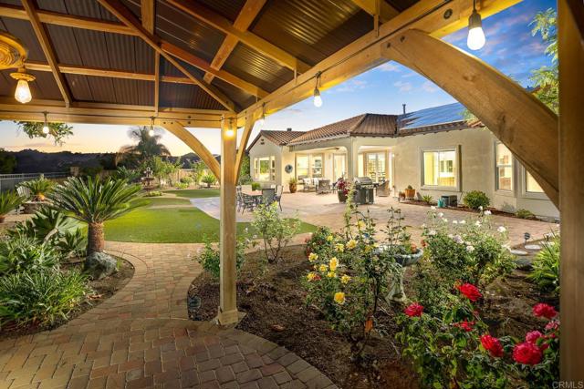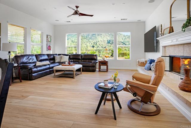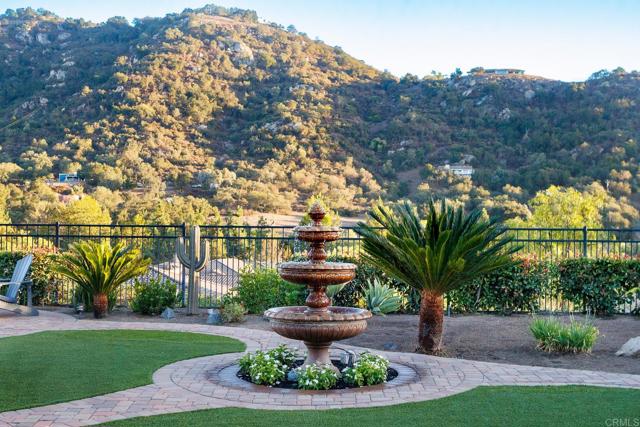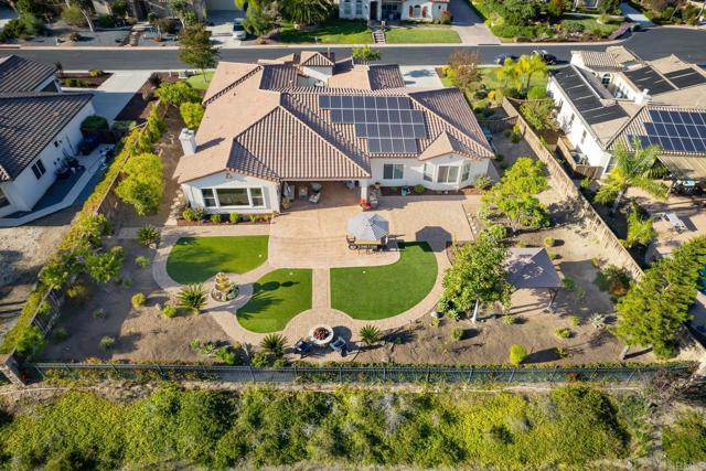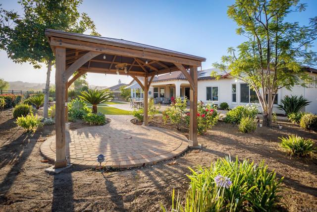 Valley Centers Gated Gem. The Community of Woods Valley is surrounded by the Native Oaks Golf Course and mountain views. This updated single story ranch style home features 3,546 SF of Open Concept living with 4 large bedrooms, 3 full baths, 1/2 bath, dedicated office, flex room, 4 car attached garages on .42 Acres on an elevated cul-de-sac. Welcome guests through the custom wrought iron gate into your openair courtyard with stone finishes. Inside formal living room and dining room are open and bright with wall to wall french doors. The combined family room, kitchen and breakfast nook with island seating has plenty of space for large gatherings. Primary suite has private bath, dual sinks, vanity, walk in closet and bay window, plenty of space to create a workout area or build a second walk in closet. On the other side of the home you will find Bedrooms 2 and 3 that share a jack and jill bath and bedroom 4 with private bath in addition there is a flex room in the middle that looks over the courtyard. Additional improvements: 72" LVP Flooring has been installed throughout the home along with 5" baseboards, interior doors are newly painted, new interior hardware, new shut off valves in baths, crown molding (extensive upgrades list available). The front landscape has lush turf and a very clean curb appeal. The Back yard is spectacular from extended covered patio, to the rose gardens to the mature fruit trees, turf, fire pit, free standing gazebo, extensive paver paths and a soaring 3 tier fountain. And to top it all off FULLY PAID SOLAR SYSTEM.