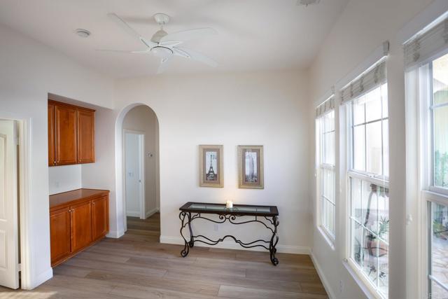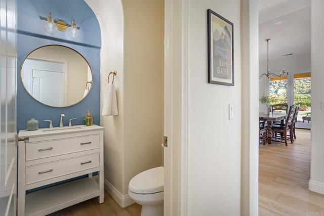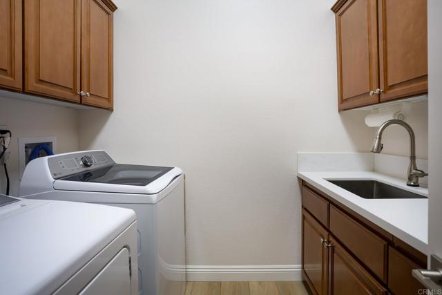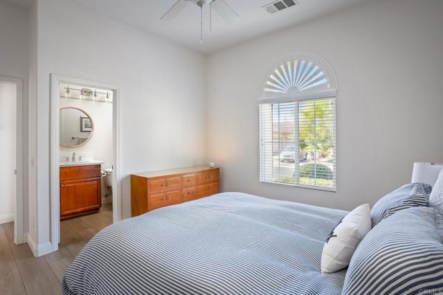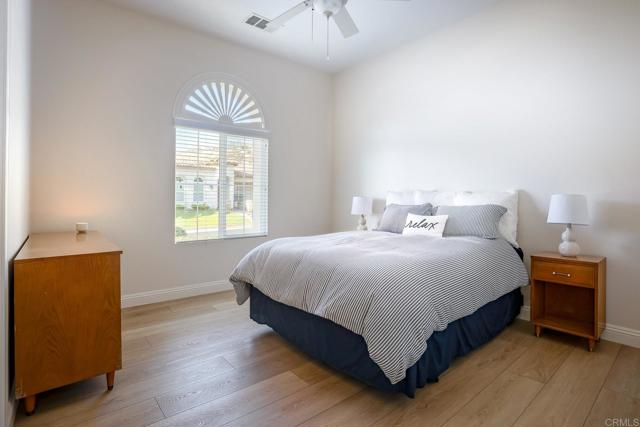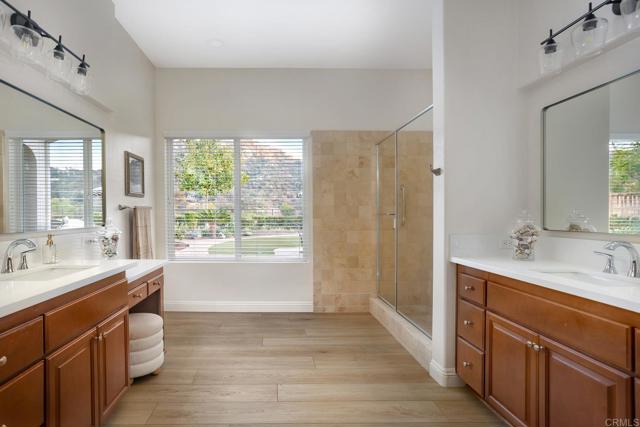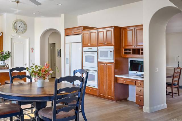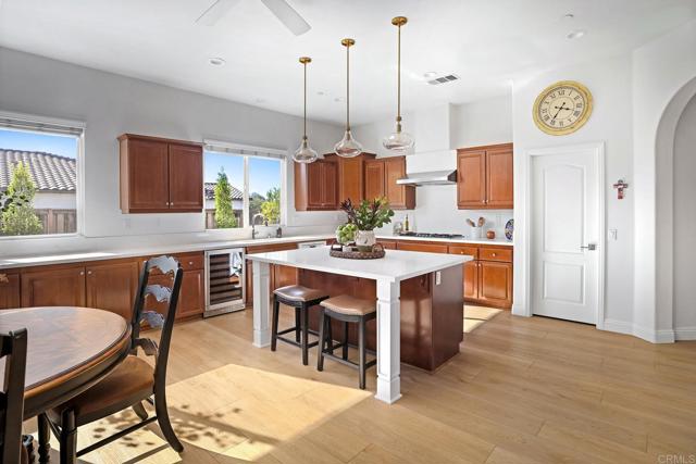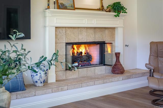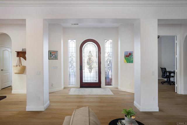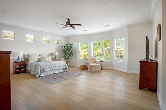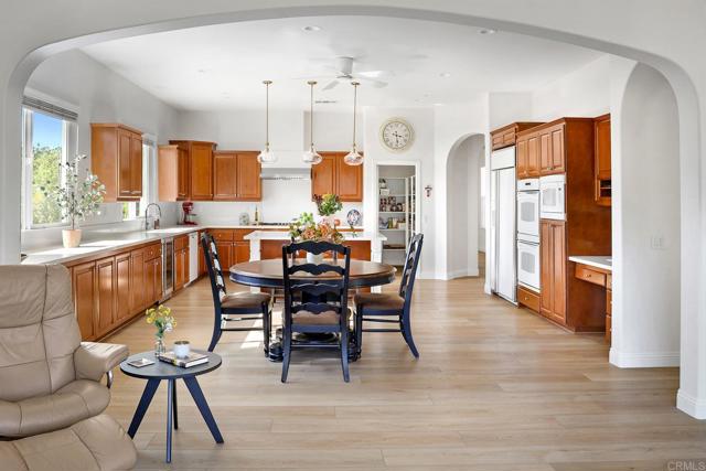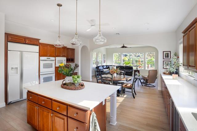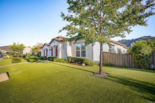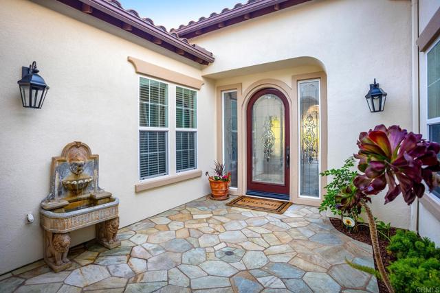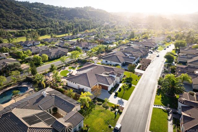 Valley Centers Gated Gem. The Community of Woods Valley is surrounded by the Native Oaks Golf Course and mountain views. This updated single story ranch style home features 3,546 SF of Open Concept living with 4 large bedrooms, 3 full baths, 1/2 bath, dedicated office, flex room, 4 car attached garages on .42 Acres on an elevated cul-de-sac. Welcome guests through the custom wrought iron gate into your openair courtyard with stone finishes. Inside formal living room and dining room are open and bright with wall to wall french doors. The combined family room, kitchen and breakfast nook with island seating has plenty of space for large gatherings. Primary suite has private bath, dual sinks, vanity, walk in closet and bay window, plenty of space to create a workout area or build a second walk in closet. On the other side of the home you will find Bedrooms 2 and 3 that share a jack and jill bath and bedroom 4 with private bath in addition there is a flex room in the middle that looks over the courtyard. Additional improvements: 72" LVP Flooring has been installed throughout the home along with 5" baseboards, interior doors are newly painted, new interior hardware, new shut off valves in baths, crown molding (extensive upgrades list available). The front landscape has lush turf and a very clean curb appeal. The Back yard is spectacular from extended covered patio, to the rose gardens to the mature fruit trees, turf, fire pit, free standing gazebo, extensive paver paths and a soaring 3 tier fountain. And to top it all off FULLY PAID SOLAR SYSTEM.