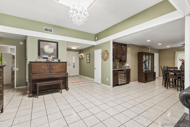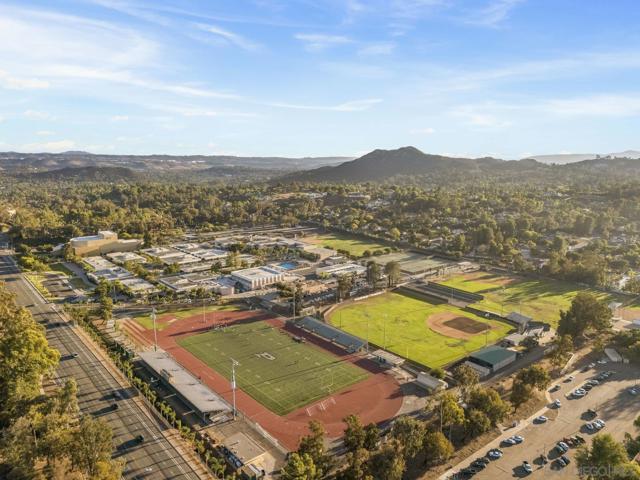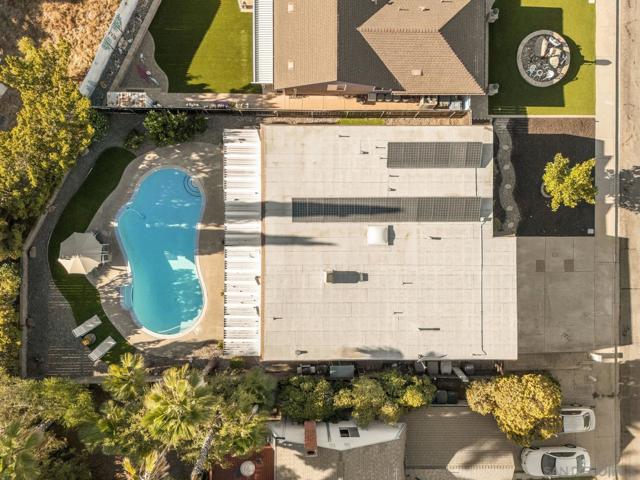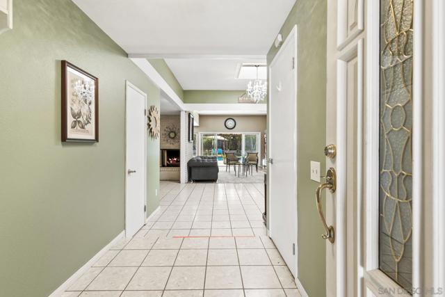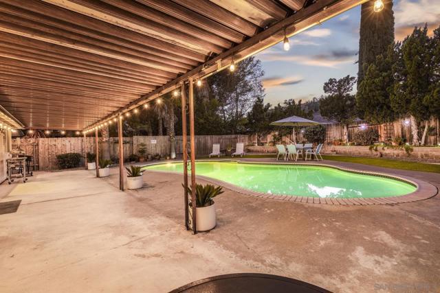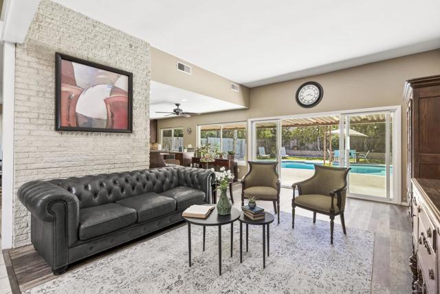 Experience the perfect blend of indoor-outdoor living in this bright, open-concept home within Poway's highly acclaimed school district, renowned for academic excellence. This unique residence features a dramatic central atrium with skylight and welcoming entry skylight. The seamless floor plan flows from the front entrance to the pool patio, creating an ideal entertaining space. The spacious layout showcases soaring 10-foot ceilings in the master bedroom, atrium, and living room. Large windows throughout flood the home with natural light. The living space features a striking brick accent wall with fireplace, creating a warm focal point. The impressive kitchen boasts granite countertops, stainless steel appliances, and abundant storage space. The grand kitchen island overlooks and opens to both the living area and backyard. A separate drink counter with additional cabinetry and wine fridge adds entertaining convenience. Step outside to your well-maintained backyard featuring a sparkling pool, large covered patio, beautiful landscaping, and mature trees—perfect for hosting gatherings. The large primary bedroom includes an ensuite bathroom, mirrored closet, and sliding door leading to the private backyard. Practical updates include an epoxy garage floor, enhanced storage solutions throughout and leased solar system. Located just one block from beloved Old Poway Park with its historic train, weekly farmers market, and frequent festivals. Walk to exceptional schools including Midland Elementary, with easy access to Twin Peaks Middle School and Poway High School. This prime.. location puts you within Poway's highly acclaimed school district, making it a sought-after destination for families prioritizing quality education. The walkable neighborhood provides convenient access to hiking trails, two major shopping areas, and public transportation. This exceptional property combines modern comfort with small-town charm in one of Poway's most desirable locations.