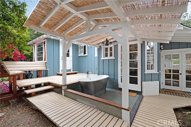 Charming Montecito Cottage on private lane . This home is so very special. It has two bedrooms and two baths, cozy living room with fireplace and additional seating area with wood burning stove off the primary suite, plus an outdoor tub. There is an additional building, with a complete kitchen and large dining area, the Dining Pavillion. Great for entertaining. All this, just a short walk to the upper village. offered furnished, partially furnished or unfurnished.
