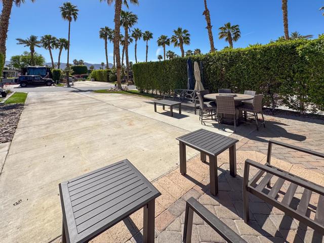 This beautiful luxury RV lot at Outdoor Resort Indio offers the perfect blend of comfort, privacy, and resort-style living. Located near the clubhouse yet tucked away against the resort entrance wall, the lot features a raised rear patio with pavers--ideal for entertaining or relaxing outdoors. Landscaping with extra palm trees and privacy hedges on both sides creates a serene, secluded atmosphere. Enjoy meals under the desert sky at a table with six chairs and two umbrellas, or fire up the BBQ for a perfect evening. The lot includes two convenient storage boxes, additional outdoor furniture, and a grassy pet area, making it both pet-friendly and practical. Whether you're looking for a personal retreat or an upscale home base for your RV lifestyle, this lot is a true gem.Outdoor Resort Indio is a Class A only RV park.