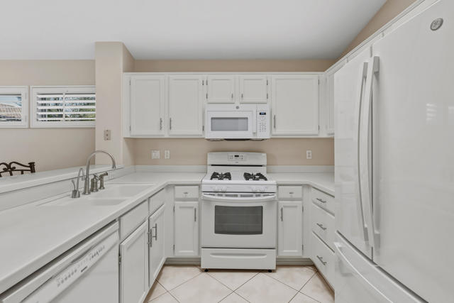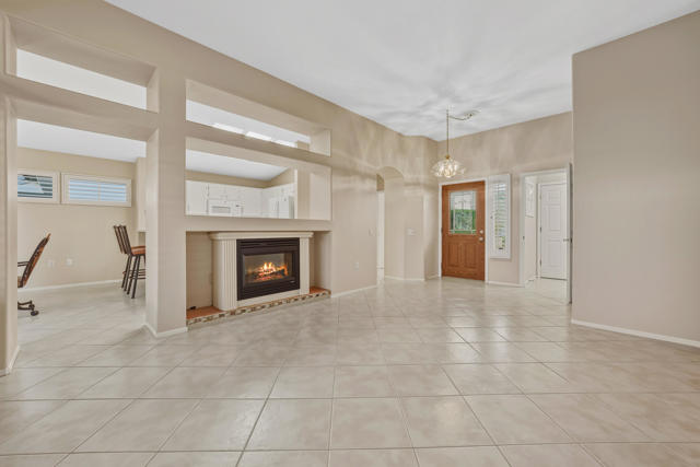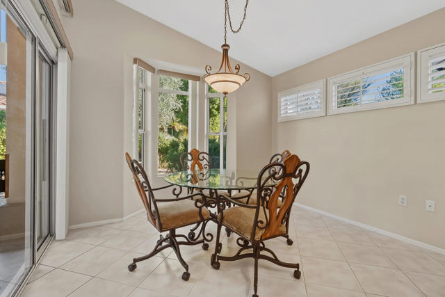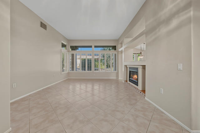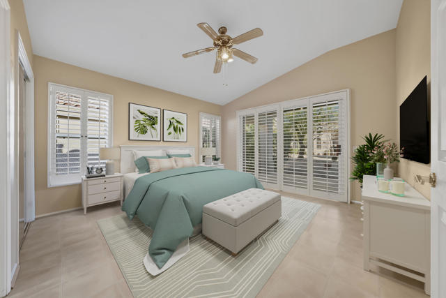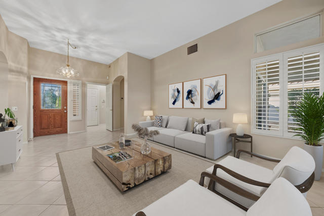 Sun City Palm Desert - Gorham. Ideally located just a short distance from both the Mountain View and Sunset View Clubhouses, this charming home offers comfort, style, and convenience. The north-facing rear yard features a spacious covered patio surrounded by lush desert landscaping--perfect for outdoor relaxation. Curb appeal abounds with a decorative concrete driveway, front courtyard, and coordinated hardscape. Inside, diagonally laid tile flooring extends throughout the main living areas, with shutters on most windows. The kitchen and dining area feature vaulted ceilings, adding to the home's open and airy feel. The kitchen includes Corian countertops, a breakfast bar, and a skylight for natural light. The dining area has a bay window and a slider leading to the rear patio. The primary suite includes two closets with mirrored wardrobe doors, a vaulted ceiling, and direct access to the covered patio. Its en suite bathroom offers dual sinks, a stall shower, and a Solatube for added light. The guest bedroom has its own slider to the front courtyard and is adjacent to a full bath with a tub/shower combination. Additional features include an interior laundry room and a two-car garage with its own air conditioning and abundant storage space. The home's main HVAC system was replaced in 2019.