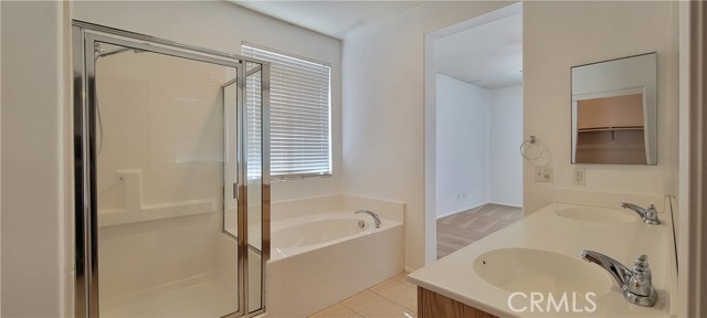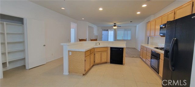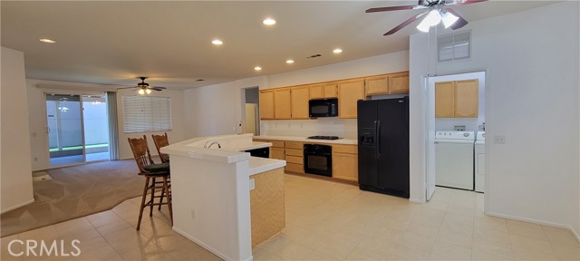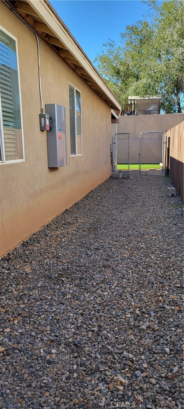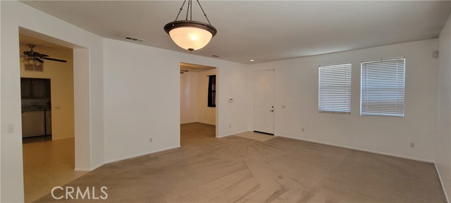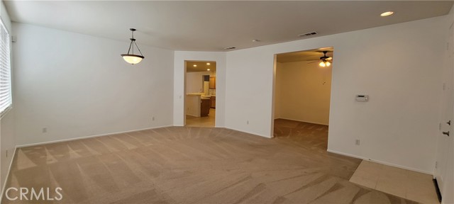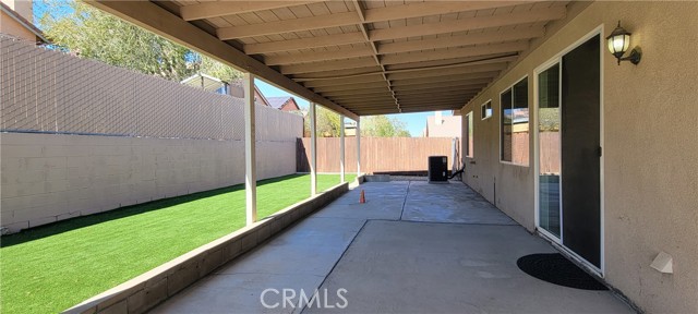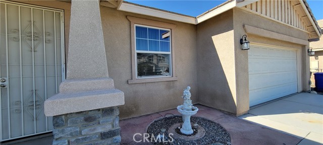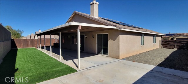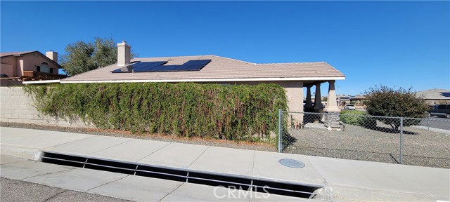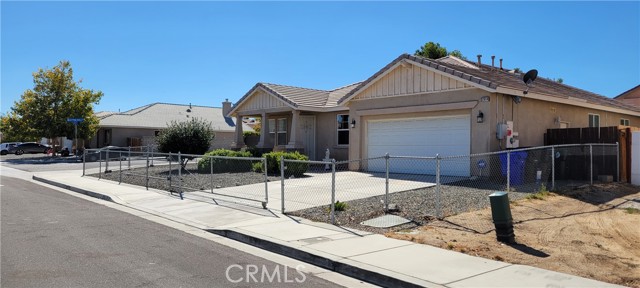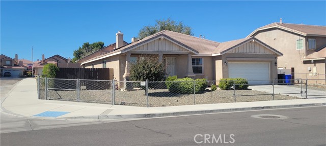 Charming corner house in Victorville. This four bedrooms, two bathrooms home features a plus room next to the living room, perfect for a home office or playroom. The interior is carpeted in the living and dining areas, bedrooms and family room. The open-concept kitchen features tile counter and backsplash and tile flooring. A built in island with sink and bar stool counter is ideal for casual dining and entertaining. There is a fireplace in the family room that sets a warm ambiance. the sliding door provides direct access to the spacious backyard with a large covered patio. The main bedroom boasts an on-suite bathroom with a sizable walk in closet, a separated tub and shower area, an enclosed toilet room for privacy, a dual sink vanity with drawers to maximize storage. The front yard features a hog wire fence with metal post and frame for security, covered pebbles, and a built in water fountain. Additional space for RV parking on the south side of the house. Equipped with leased solar panels to reduce your electricity bills and support sustainable living.