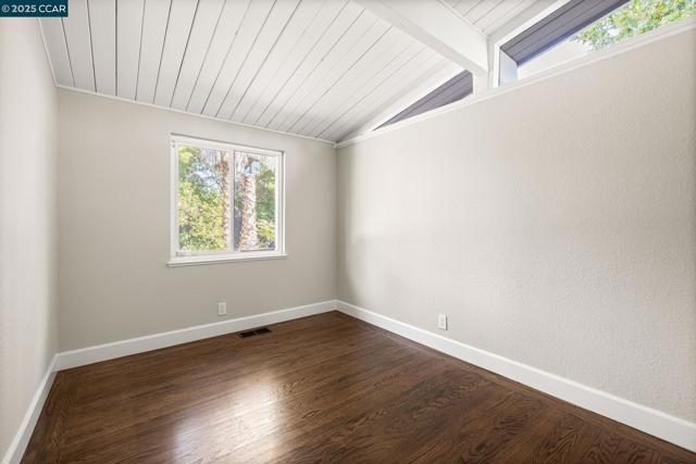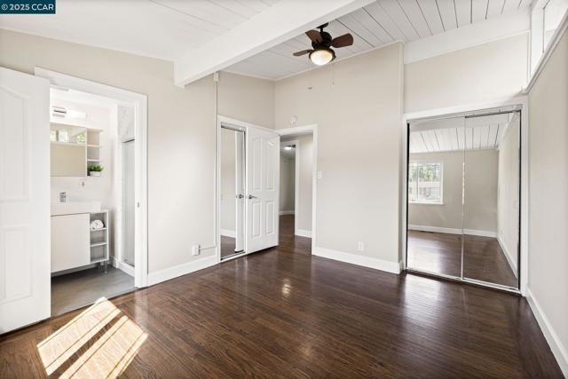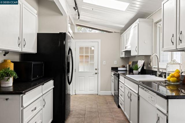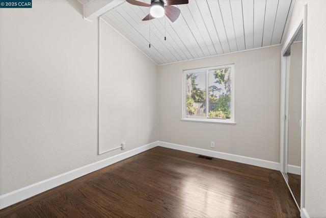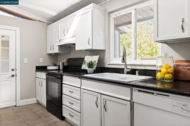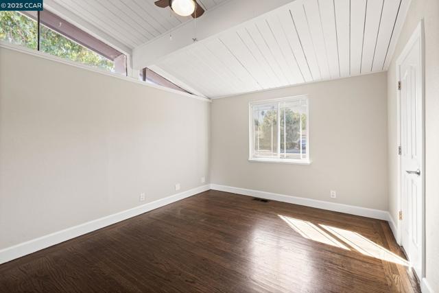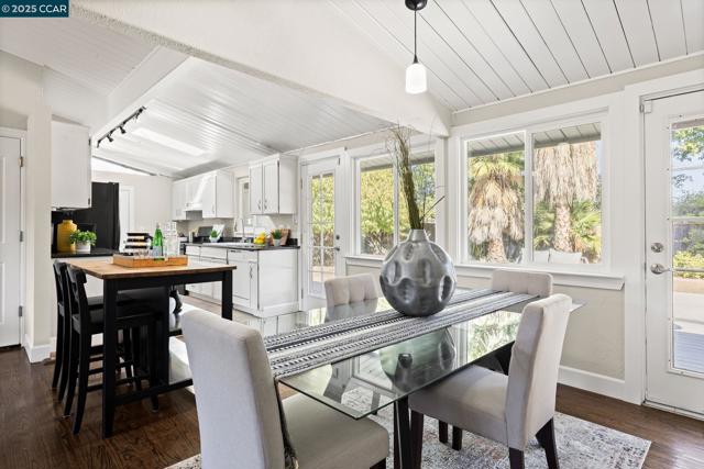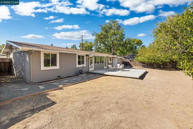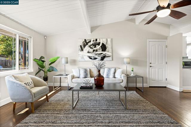 Single-story, 3 bedroom, 2 bath, home blends mid-century design elements with modern comfort in an inviting, light-filled layout. Vaulted white plank ceilings and rich wood floors create warmth and character throughout. The open floor plan connects a spacious living room to the dining area and kitchen, perfect for everyday living or hosting friends. The kitchen pairs granite countertops with black appliances and classic white cabinetry for a clean, cohesive look. A separate laundry and mud room adds everyday convenience with extra storage and access to the backyard. Down the hall are three comfortable bedrooms, including a private primary suite with its own bath, and two additional rooms ideal for guests, family, or a home office. Step outside to a generous backyard offering endless possibilities, plant a garden, create an outdoor dining area, or enjoy relaxing afternoons on the sunny deck. Tucked away on a court close to schools, parks, BART and shopping, this home offers easy access to everything you need.