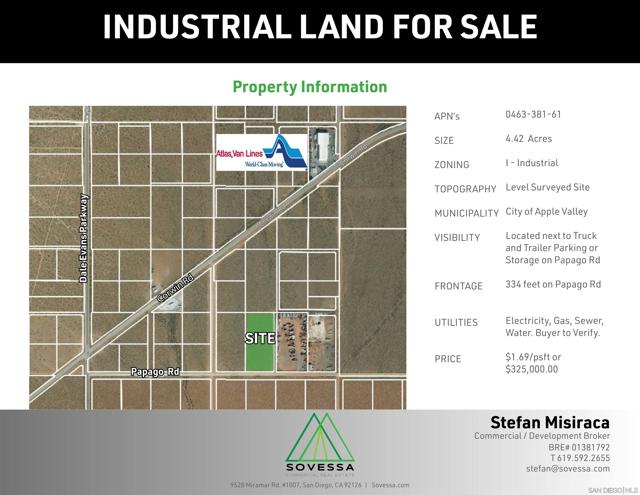 Vacant industrial land that lies within the North Apple Valley Industrial Specific Plan, an area where many developers and land investors have acquired hundreds of acres in anticipation of future growth. The Specific Plan includes 6,221 acres of designated land to facilitate industrial and commercial development for the city. Existing development includes Walmart' s 1.3 Million square foot Distribution Center, and Big Lots 1.4 Million square foot Distribution Facility with an estimated 400-500 new jobs and Ameritex Manufacturing Plant with an estimated 150 new jobs. Over 6.7 Million SF of industrial buildings in various stages of entitlement nearby
