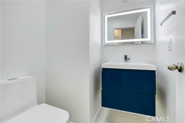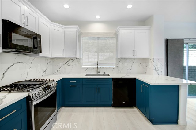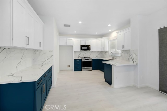 Welcome to an exceptional opportunity in Santa Clarita! This beautiful residence, boasting 3 bedrooms and 2.5 bathrooms, offers ample space for comfortable living. As you step inside, recessed lighting throughout creates a warm and inviting ambiance, complementing the airy kitchen—a chef's dream with its blue and white shaker cabinets, quartz countertops, and backsplash. Equipped with stainless steel appliances, including a farm sink and gas range, the kitchen seamlessly blends style with functionality. But there's more to love about this home. The main floor features a modern half bath with a floating vanity, enhanced by sleek OLED mirrors. Nest central air and heat ensure year-round comfort, while the newly painted interior adds a fresh touch to the home's aesthetic. Upstairs, the primary bedroom retreat awaits, complete with a ceiling fan, walk-in closet, and a beautifully tiled en-suite bathroom featuring a dual sink modern vanity and multi-jet shower system. Convenience is elevated with upstairs laundry, making chores a breeze. Additionally, a home office nook provides the perfect space for productivity or relaxation. Throughout the upstairs, elegant cherry wood flooring graces the hallways and bedrooms, adding warmth and character to every space. Artificial turf in both the front and back yard to enjoy a lush, green landscape year-round with minimal maintenance. Embrace the essence of modern living and make this exquisite residence your new home sweet home.