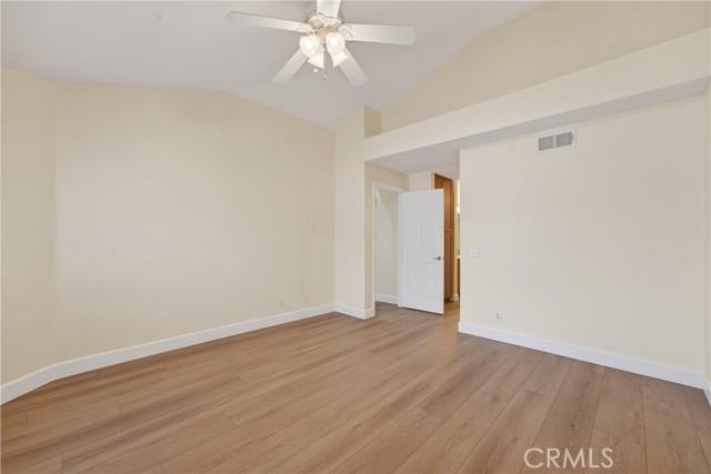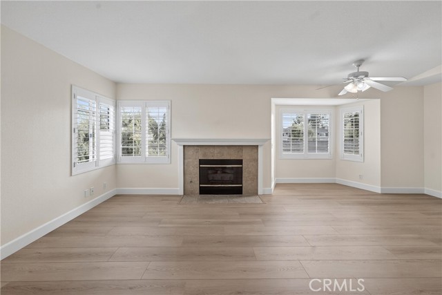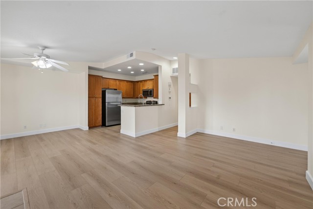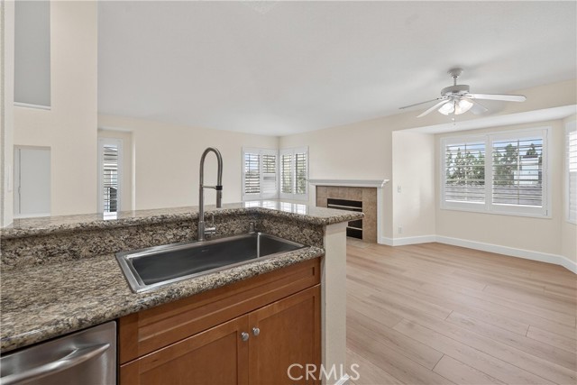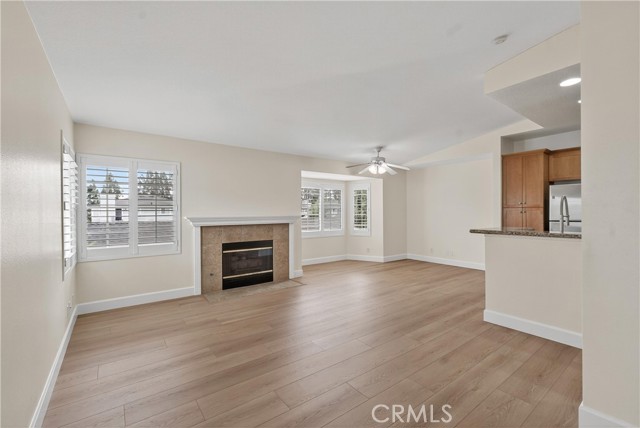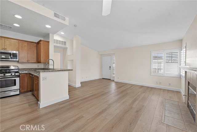 Welcome to this corner unit penthouse condo located in the highly sought after gated community of Canyon Villas. This spacious 1 bedroom, 1 bathroom home has been meticulously maintained and features NEW LAMINATE WOOD FLOORS. Soaring vaulted ceilings enhance the open and airy feel, while plantation shutters add a touch of timeless elegance. The oversized private patio is the perfect spot to relax and enjoy the beautiful mountain views. The bright, open floor plan includes a cozy fireplace, ceiling fans for added comfort, and an upgraded kitchen with granite countertops, stainless steel appliances, an upgraded single basin kitchen sink, and generous storage. The refrigerator, washer, and dryer are all included for added convenience. The spacious bedroom suite offers a peaceful retreat with high ceilings, an upgraded bathroom with dual sinks, and a large walk-in closet. Additional highlights include a large 1 car garage with extra storage space. Residents of Canyon Villas community enjoy access to two resort style pools and spas, BBQ areas, a fitness center, and a clubhouse. Ideally situated in the heart of Aliso Viejo, this home is close to premier shopping, dining, award winning schools, parks, hiking trails, and just a short drive to the beach.