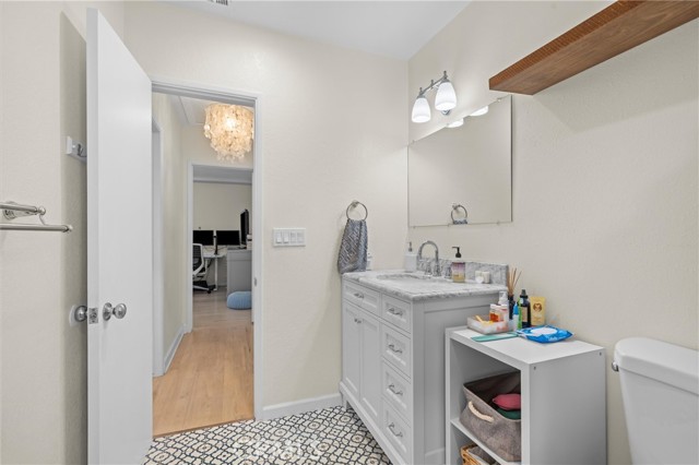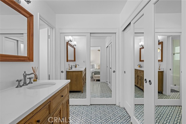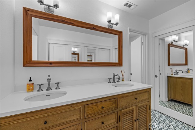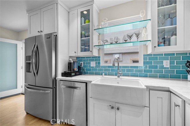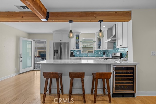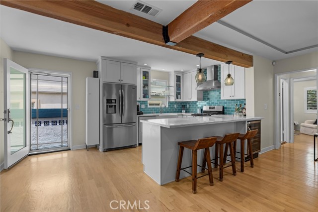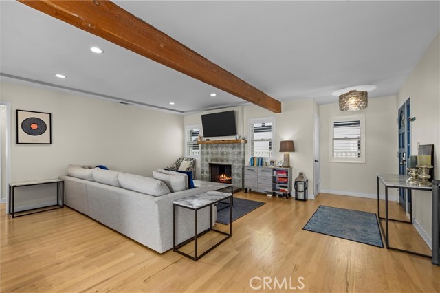 Coastal charm meets modern comfort in this light-filled 3 bed, 2.5 bath home nestled in the heart of the Tree Section of Manhattan Beach. Thoughtfully designed for both everyday living and relaxed entertaining, this home welcomes you with an airy living room featuring rich hardwood floors, and a cozy wood burning fireplace, perfect for cool coastal evenings. The open-concept kitchen is a showstopper, bathed in natural light and accented by marble countertops, bar seating, a farmhouse sink, stainless steel appliances, a wine fridge, and a bold teal tile backsplash. A side door offers easy access to the private backyard, seamlessly connecting indoor and outdoor living. To the right, two generously sized bedrooms share a beautifully renovated full bathroom. To the left, you’ll find a convenient powder room, a dedicated laundry area with hookups, and the spacious primary suite. French doors open to the side patio, while the spa-like en-suite features a dual sink vanity, stylish tile flooring, and ample closet space. The backyard is an entertainer’s dream, complete with a custom putting green and room for al fresco dining or weekend BBQs. Located moments from award-winning schools, downtown shops and restaurants, and world-class surf, this home offers the best of beachside living.