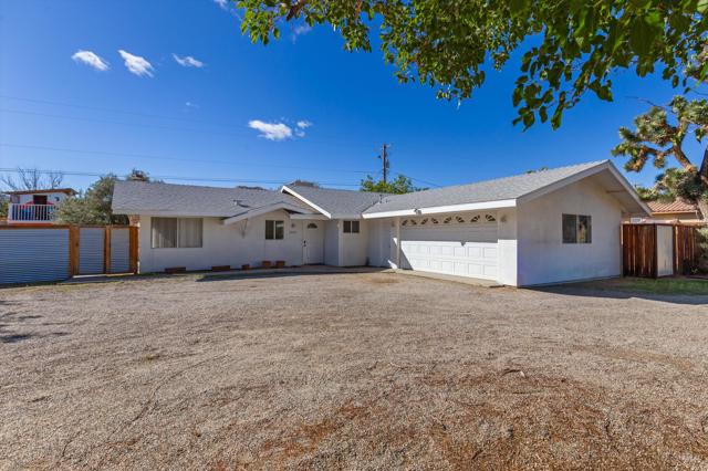 Located in Yucca Valley's picturesque Storey Park neighborhood, this 3-bedroom, 2-bath home sits on a near half-acre and offers an updated interior and a bright, open layout. Enjoy an inviting modern kitchen with sleek quartz countertops, stainless steel appliances, and abundant cabinet space. The dining area flows seamlessly into the living room, which is adorned with a large, beautiful stone fireplace and sliding doors that open to a covered patio. The spacious primary bedroom has generous closet space and an en-suite bath. Both guest rooms are well-sized and share the updated guest bath. The 2-car garage, currently utilized as a game room, offers laundry tucked conveniently inside. Out back, you'll enjoy the fully fenced yard, complete with tree-house, swings, fire pit, beautiful mature trees (including Olive and Joshua Trees) and a 15' vehicle gate has plenty of room to add amenities as you see fit. Just minutes from local shopping, dining, and Joshua Tree National Park