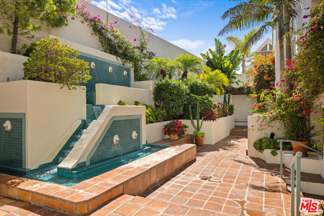 Wonderful opportunity to lease right in the heart of the Palisades while you are rebuilding! Controlled access iconic building completely remediated, freshly painted and available immediately for one or two year lease. Furniture available, but can be moved out if preferred. Terrific wrap around patio makes it feel like a real home. Two large bedrooms on separate sides of the condo, one has been used for a den/office with a Murphy bed. Primary bedroom has patio access and a large dual sink bathroom and walk-in closet. Full size washer and dryer in the unit. High ceiling living room, charming dining area, eat in kitchen with center island. Two assigned parking spaces in underground garage, accessed with clicker that opens and closes the gate. The 19 unit complex is known for its beautifully maintained courtyard with Hacienda style landscaping.