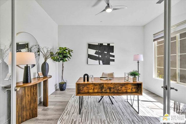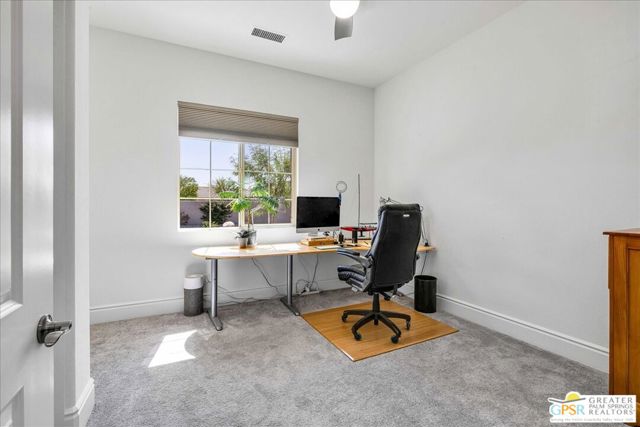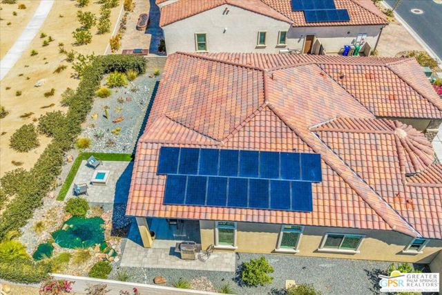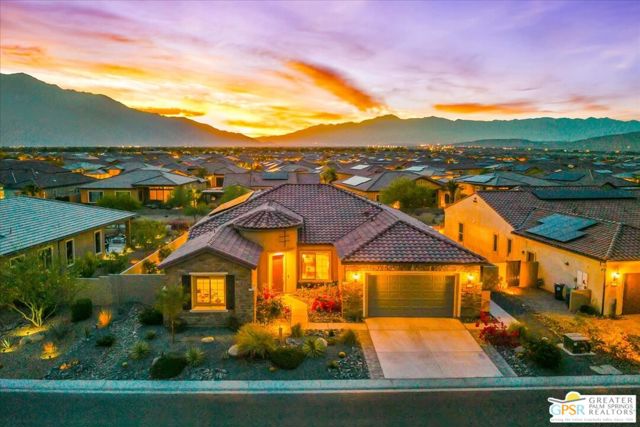Discover a fresh opportunity to enjoy resort-style living in the heart of Del Webb Rancho Mirage, the desert's premier 55+ community. This beautifully reintroduced Tuscan-style Phase 5, Plan 8 Serenity home captures sweeping mountain views and blends timeless elegance with modern comfort - all enhanced by owned solar and thoughtful upgrades throughout. Inside, the open-concept layout features three bedrooms, a versatile den/office/media room, and two baths - designed to balance relaxation and entertaining with ease. Rich porcelain wood-look tile flooring, elegant 7" baseboards, custom window treatments, and designer ceiling fans bring warmth and sophistication to every space. The chef's kitchen takes center stage with an upgraded KitchenAid appliance suite - including a built-in refrigerator - 42" upper cabinets with crown molding, and a grand executive island offering extra storage, power outlets, and luxurious double-thick quartz countertops. Wake up to breathtaking mountain vistas from the light-filled primary suite, featuring a spa-inspired bath with quartz dual vanities, sleek fixtures, and a custom-tiled walk-in shower. A generous walk-in closet completes this serene retreat. The guest wing and den are ideally separated, providing comfort and privacy for visiting friends and family. Step outside to a stunning, fully landscaped backyard oasisperfect for year-round desert living. Enjoy panoramic mountain views, gather around the built-in firepit, or unwind beside the tranquil custom pond and water feature. Additional highlights include a central vacuum system, air-conditioned oversized garage with overhead storage, EV charging outlet, and more. Within the exclusive gates of Del Webb Rancho Mirage, you'll have access to an impressive array of amenities -from the resort-style pool and spa to tennis, pickleball, bocce ball, fitness facilities, and a vibrant social calendar. Experience a new chapter of luxury, lifestyle, and community living - right here at Del Webb Rancho Mirage.