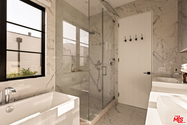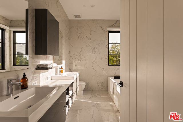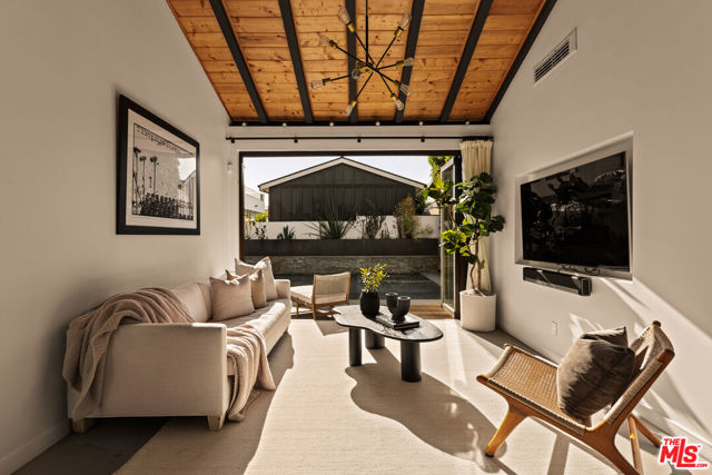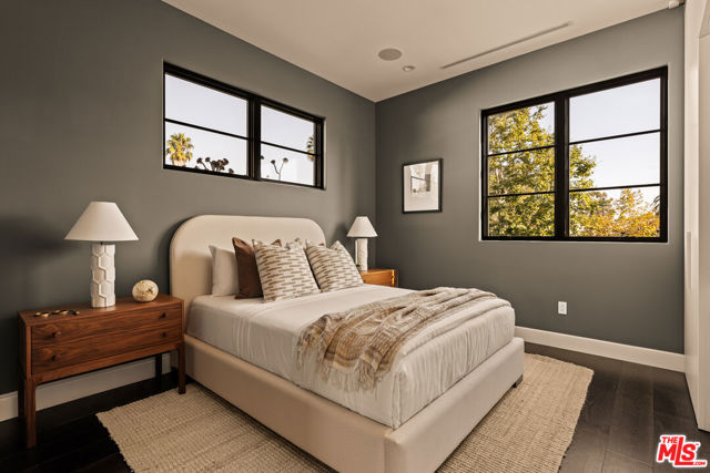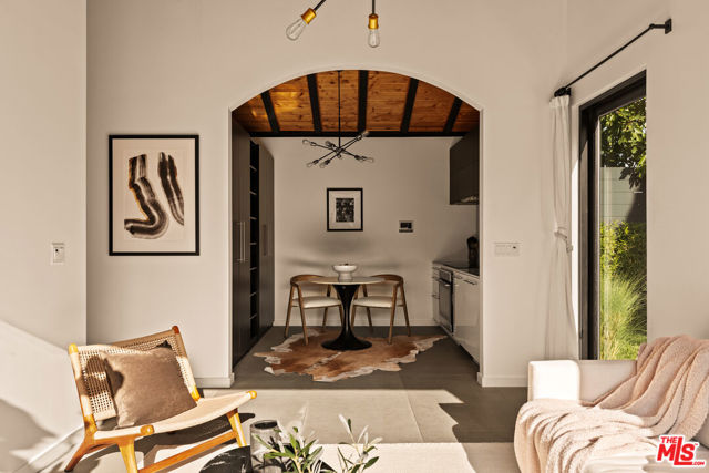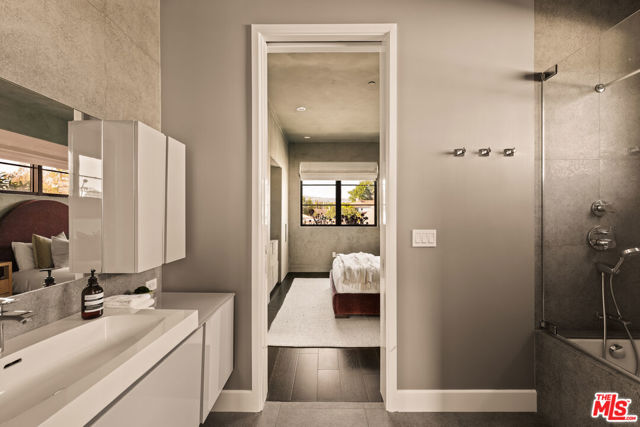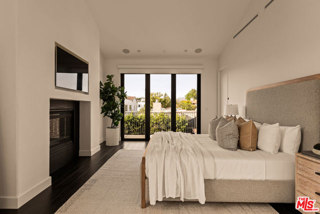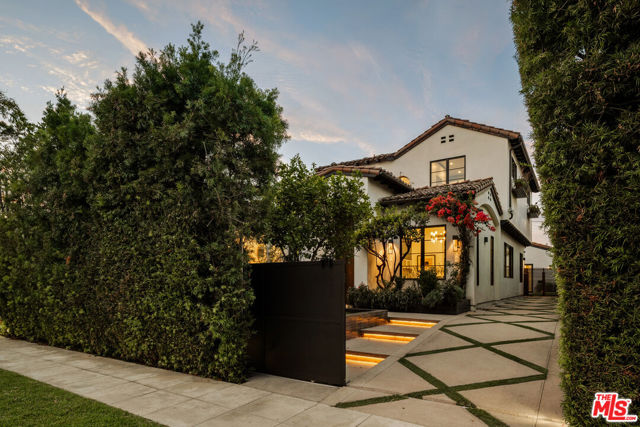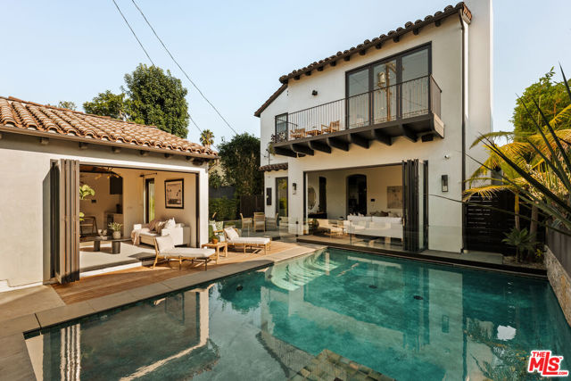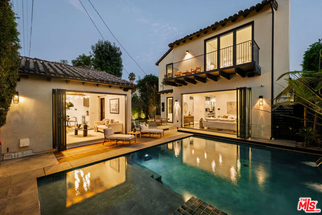 Tucked away on a coveted street in prime Beverly Grove, this Spanish inspired contemporary offers timeless character blended with modern comforts. Behind a gated entry, the 5 bedroom, 4.5 bathroom residence includes a newly built ADU ideal for guests, work from home, or additional income. A dramatic arched front door opens into a thoughtfully designed floor plan, where soaring ceilings, rich mahogany toned wood floors, and curated designer finishes echo the home's architectural roots. The formal living room features a statement fireplace, custom inlaid tile, and a storybook window that floods the space with natural light. The chef's kitchen is outfitted with Miele appliances, a marble waterfall island, and custom cabinetry, seamlessly connecting to an open-concept dining and family room. Additional luxuries include integrated speakers throughout, and a home security system. Floor to ceiling glass doors create a seamless indoor-outdoor flow to the private backyard oasis complete with a sparkling pool, spa, and lounge-ready patio. Professionally landscaped, the yard offers numerous upgrades such as custom pool lighting and recently installed safety fencing. Upstairs, the expansive primary suite offers a fireplace, private terrace with views of the Hollywood Hills, automated black-out blinds and a spa-inspired bath. Two additional upstairs bedrooms share a stylish Jack-and-Jill bath, while a guest suite downstairs offers privacy and flexibility. The ADU features a full kitchen and bathroom, ideal as a guest house, studio, or rental opportunity. Perfectly positioned in one of Los Angeles' most refined and walkable enclaves, this residence offers seamless access to nearby Melrose Avenue, The Grove, and the Beverly Center, along with a curated array of renowned restaurants, boutique shopping, and cultural landmarks. A rare offering that blends architectural character with an address defined by both elegance and ease.