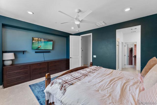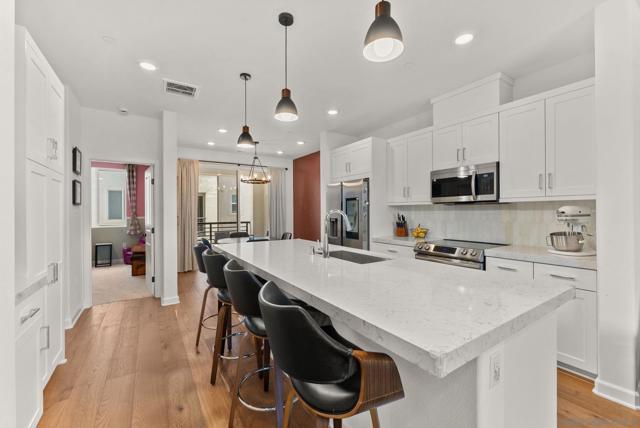 Back on the Market, no fault of the home or sellers. Built in 2024! This three-story townhome offers a 1st floor fully separate suite—perfect for guests or a home office—and direct access to a spacious two-car garage. Upstairs on 2nd level, enjoy an open and airy floorplan with abundant natural light. The gourmet kitchen boasts quartz countertops, stainless steel appliances, and flows seamlessly into a combined dining and oversized living area. From the balcony take in scenic views of the area and community pool—ideal for relaxing or entertaining. 3rd floor is embellished with a large primary bedroom suite with its own full private bathroom, plus two additional bedrooms and another full bath. Luxury vinyl flooring runs throughout the main living spaces, while cozy carpet adds comfort to the bedrooms. Solar panels, solar battery storage, and whole house water filter system. Don't miss your chance to own this townhome!