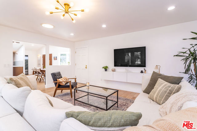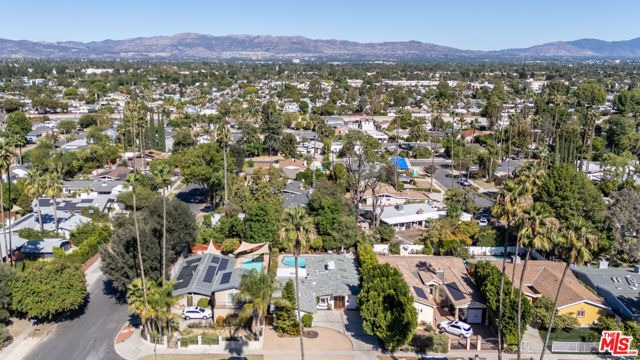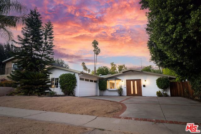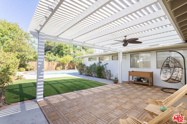 Located in the highly coveted Corbin Palms neighborhood of Woodland Hills, this Mid-Century Marvelous pool home was designed by renown Architects Dan Palmer & William Krisel and built by The Alexander Construction Company. Before Palmer & Krisel went on to design thousands of homes in Palm Springs forever influencing the cities modern look, they designed Corbin Palms right here in Woodland Hills. Their designs emphasized simplicity, privacy with functionality and a profound respect for the natural landscape. This residence embodies clean lines, natural lighting with modern upgrades for the best of today's California living and entertaining. The moment you step through the dramatic double door entry you will be in awe of the vaulted ceilings and natural light cascading in from the double pane windows and skylights while showcasing the recently remodeled modern aesthetic. New drywall coating with interior paint, Tasteful engineered hardwood flooring and recessed lighting throughout the living spaces. Gorgeous kitchen featuring new soft close cabinetry with quartz countertops, floating shelves, spacious pantry, tile backsplash with LG and Samsung stainless steel appliances. Open, light and bright floorplan offers a formal living room with floor to ceiling tiled gas fireplace, large dining area and huge family room with dry bar and French Doors that seamlessly connect to the private backyard. New artificial turf, covered pergola and sparkling swimming pool will make you feel like you're on vacation every day. Designer inspired Primary suite opens to the outdoor living space and is both simple and luxurious with its neutral double sink vanity, Delta brushed brass hardware, tastefully tiled flooring and shower with frameless glass and freestanding soaking tub. Dual closets including a Custom walk-in modular closet system. Two additional bedrooms with engineered hardwood flooring, vaulted ceilings, skylights and Jack and Jill access to an updated bathroom. More new features include exterior paint, water heater, double front doors, Nest thermostat, recessed lighting, fixtures, electrical outlets, switches and pool filtration system. Conveniently located near restaurants, shopping, The Westfield Topanga Village, Warner Center, public transportation and more!