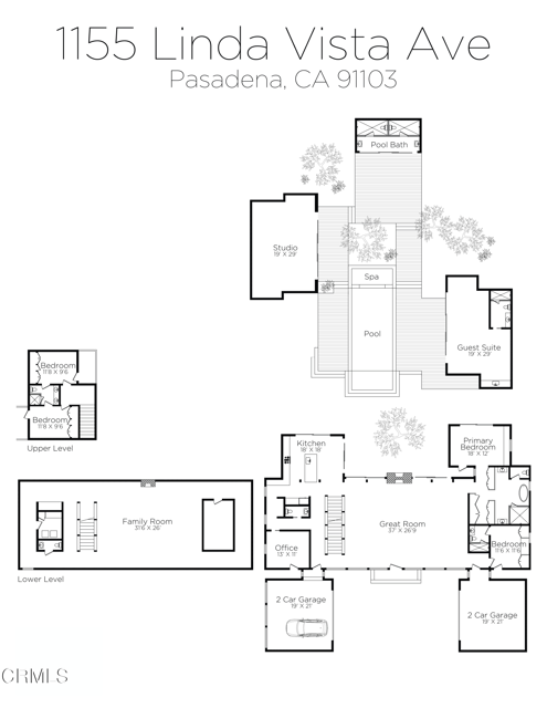 Stunning and newly constructed in 2021, this extraordinary Pasadena compound is thoughtfully nestled on over half an acre within a grove of majestic California oak trees in the beautiful Linda Vista neighborhood above the iconic Rose Bowl. Designed with great sensitivity to its natural surroundings, the residence blends a striking yet harmonious palette of concrete, steel, glass, and wood. Expansive angled gables, grand scale, and restrained details create an aesthetic that feels both modern and timeless--embracing the serenity of the landscape and the enduring character of California architecture.The heart of the home is the warm and inviting kitchen, outfitted with custom-milled cabinetry, chef's-grade appliances, and refined finishes. Sliding glass doors open directly to an outdoor dining patio and fireplace, a seamless connection between indoor and outdoor living. The main living area is defined by vaulted ceilings, walls of glass, and a fluid layout that blurs the boundaries between architecture and nature, filling the space with light and tranquility.The first-floor primary suite serves as a private retreat, featuring a luxurious, paneled dressing room and spa-like bath. A guest suite and private den or library complete the main level, while a sculptural, wood-shelved staircase ascends to two additional bedrooms--each with its own balcony and a shared bath. The lower level is dedicated to entertainment and leisure, offering a grand media and play space anchored by a dramatic fireplace. Outdoors, the estate unfolds around a large east-west swimming pool and spa framed by two magnificent specimen oaks. Surrounding the pool, three complementary structures--a guest house, an office or studio building, and a pool bath house--mirror the main residence's elegant double-gable design and soaring ceilings. A motor court, flanked by dual two-car garages, provides both convenience and a sense of stately arrival.This masterfully crafted property embodies the rare synthesis of architectural innovation, natural beauty, and timeless California living--an inspired retreat where design and environment exist in perfect harmony.