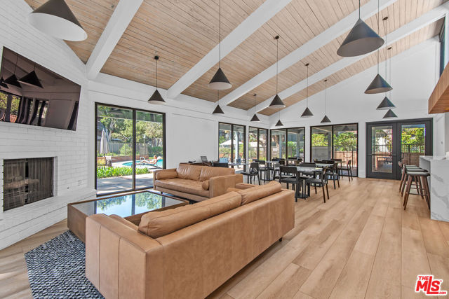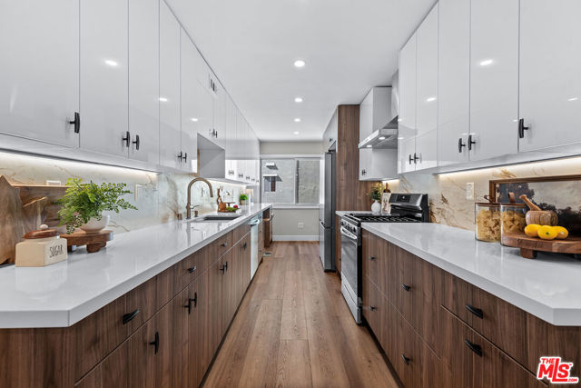 This exquisitely renovated corner townhome features two bedrooms, two bathrooms, and is located in the highly desirable Villa Velletri community of Marina Del Rey, only steps from the Marina Marketplace shopping and entertainment center. Designed with maximizing luxury, sophistication and comfort in mind, you will entertain on a grand scale in your 1,398 sqft living space. This one-of-a-kind home boasts a Modern Italian style, offering tons of natural light, wide oak vinyl floors, recessed LED lighting, and updated electrical outlets, dimmers, and switches throughout. Pass through the front door into a spacious living room with high ceilings, an elegant porcelain electric fireplace and a designer organic chandelier, and enjoy the relaxing view of your south-facing patio (Approx. 250 sf) with new gas BBQ hookups and electrical plugs. The designer kitchen shines with soft close glossy white and walnut cabinets with tons of storage, white quartz countertops, dramatic porcelain backsplash, Samsung stainless steel appliances, a built-in pantry with hidden microwave outlets, a built-in trash pull out, and a custom breakfast bar or workstation area. The dining level is perfect for entertainers and features a custom bar or storage area in walnut with white quartz countertops, dramatic porcelain backsplash. The primary suite offers an en-suite spa-like bathroom unique backlit circular vanity mirror flanked by pendant lights above a designer vanity, a walk-in shower with a ceiling mounted showerhead and a convenient hand shower, and his and hers walk-in closets with custom closet organizers already installed, and a striking smoked glass slider for the larger walk-in. Dramatic porcelain tile stretches from floor to ceiling, and includes a herringbone pattern on the bath floor and a pebble pattern on the shower floor. The guest bedroom offers plenty of natural light and closet space, and can easily flex to function as an office. The guest bath has been elegantly upgraded with new floor to ceiling tile, new pebble shower and bath tile, a designer vanity with brushed gold plumbing and lighting fixtures. Upgrades also include 220V plug for EV charger in the attached two car garage, updated electrical panel, LED recessed lights, updated laundry hookups, and freshly painted ceilings and walls. Villa Velletri is a gated community with lush landscaping, 4 pools and spas, clubhouse, and ample guest parking. Enjoy the Marina lifestyle. Close to world famous beaches, Abbot Kinney, trendy shops/restaurants, movie theaters, Marina access, LAX and more! Villa Velletri HOA includes water, trash, high speed Spectrum internet and cable, EQ insurance, and association insurance.