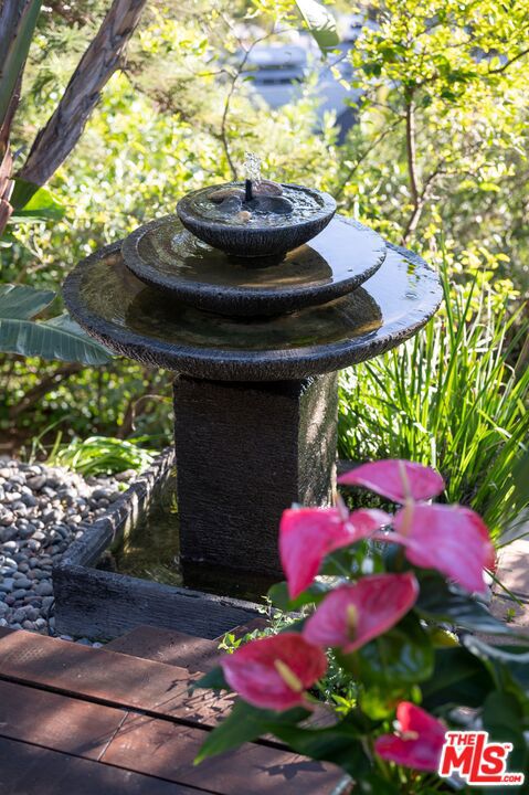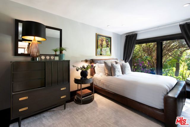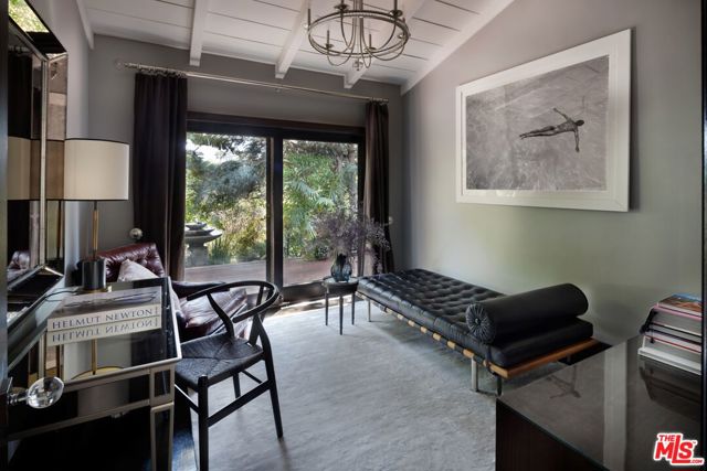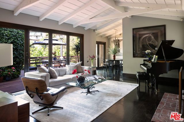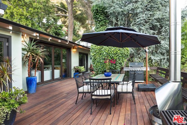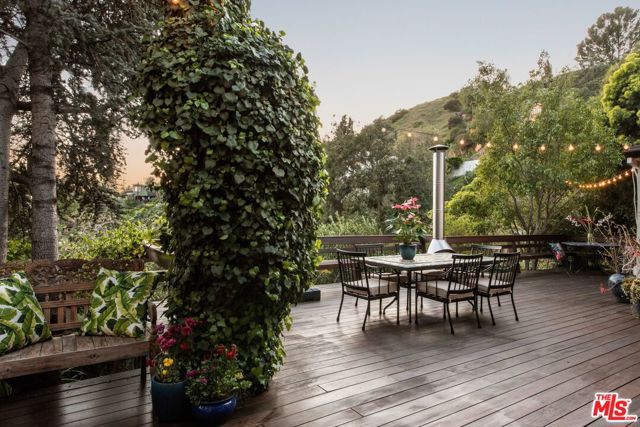 Rarely Available! Enchanting, private, peace-filled oasis hidden in the Hollywood Hills. Beautifully furnished, chic & modern bungalow that's stylish and inviting with all new designer furnishings, 2 fireplaces and (of course) a grand piano. This light-filled home offers wonderful indoor/outdoor living with a stunning south-facing retractable wall of glass in the living room and with each room opening directly onto an expansive 1100 sq ft backyard deck. The lush surroundings are beautifully landscaped with flowers and mature trees. There's an outdoor dining area with a Malm fireplace, gas grill and sunken Jacuzzi. Enter the front of the home through a private gate that leads into a tranquil courtyard and provides added peace and security. Overlooking Hollywood with its iconic palm trees standing tall against the blue sky, the private outdoor view reminds you that you're living somewhere very special. Like a Chateau Marmont bungalow or garden suite at the Beverly Hills Hotel but with the seclusion and tranquility of a single family home.