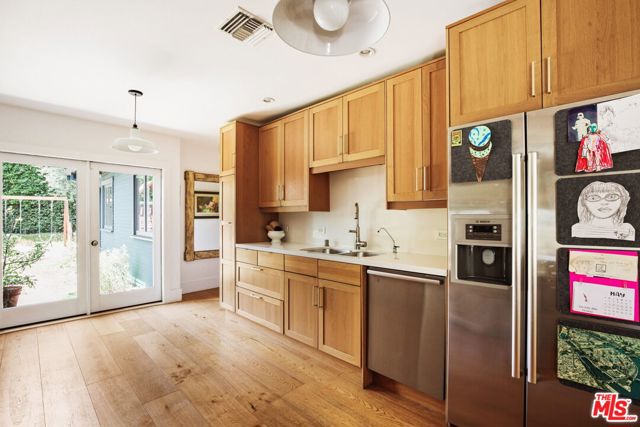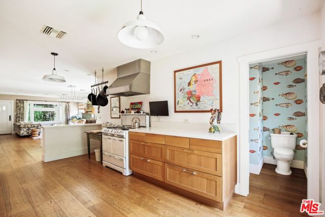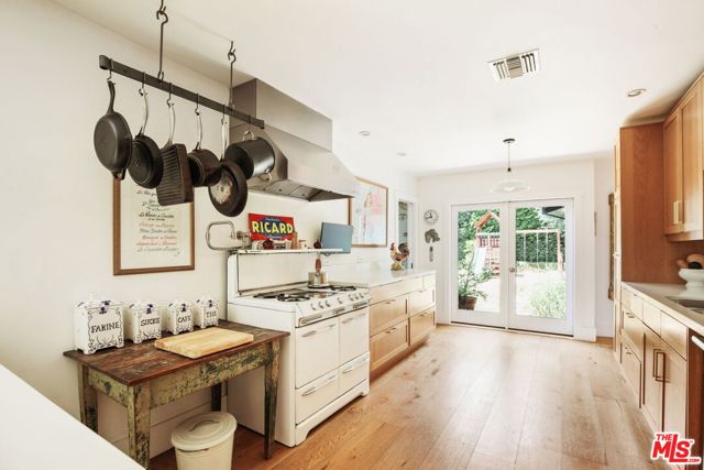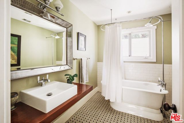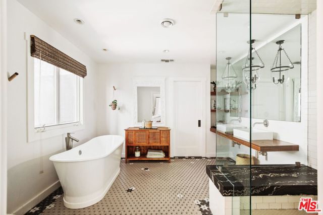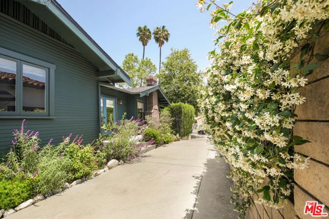 North of Los Feliz Boulevard, at the foot of Griffith Park and just blocks from the neighborhood's best cafes, restaurants, and shops, stands a beautifully renovated 1920s California Craftsman with designer upgrades throughout its bright, open floor plan. The 3 bd/2.5 ba home welcomes you with a private porch surrounded by lush greenery. The grand primary suite features vaulted ceilings, a walk-in closet, and a spacious, luxurious ensuite bathroom showcasing artful Japanese Solistone tiles, a spa-like marble and tile steam shower, a pedestal tub, and a custom floating double vanity. The large second bedroom, also vaulted, has a full guest bath with pedestal tub/shower. The third bedroom, which can also function as a den, is just off the great room. The custom kitchen opens to the living spaces that flow seamlessly outdoors, making this home an entertainer's dream. Multiple sets of French doors lead to the mature landscaped garden and a converted garage with HVAC that works perfectly as an art studio, gym, office, or storage. The yard features shade and fruit trees along with a flagstone dining patio/barbecue area for al fresco evenings. Adorned throughout with well-appointed finishes and technology, highlights include custom window treatments with bespoke curtain rods, European wide-plank white oak floors, designer light fixtures and hardware, a home security system, and smart lighting. All this while being moments to the hiking trails of Griffith Park and the Village favorites: Blue Bottle, Little Dom's, and All Time.