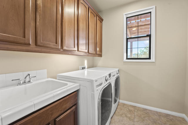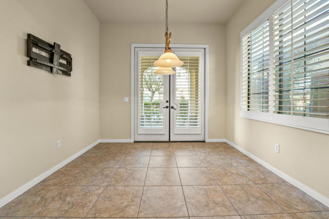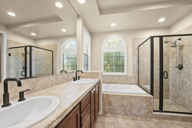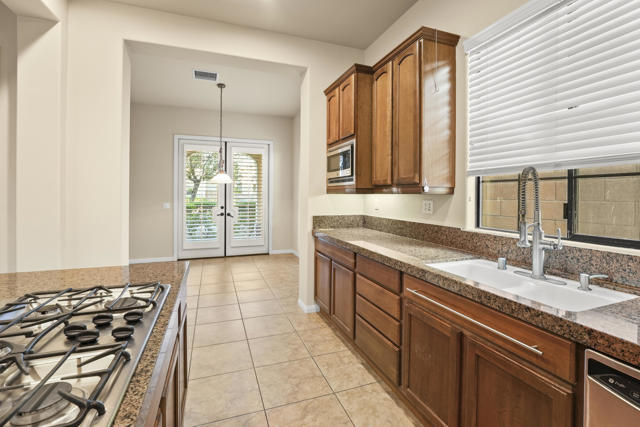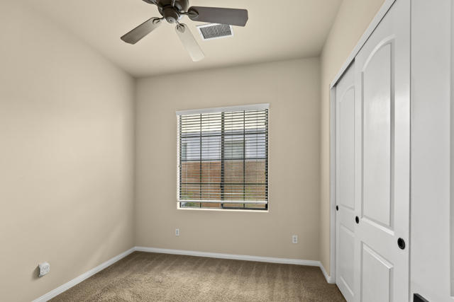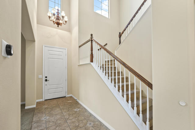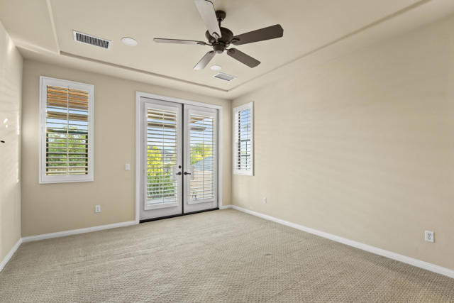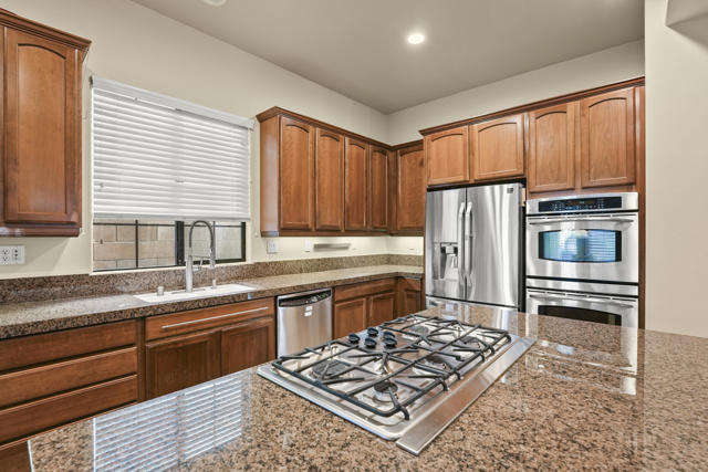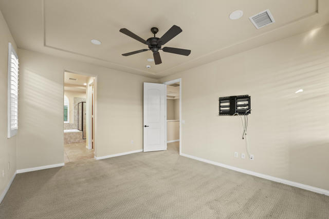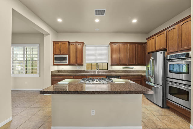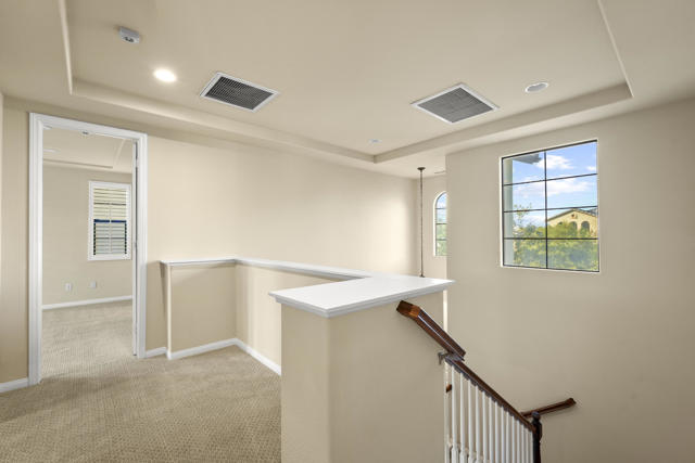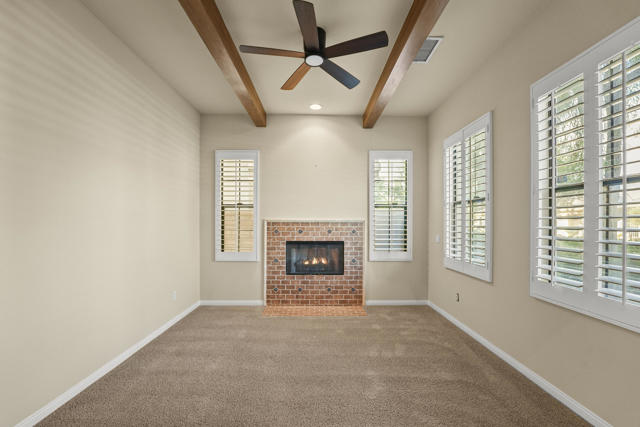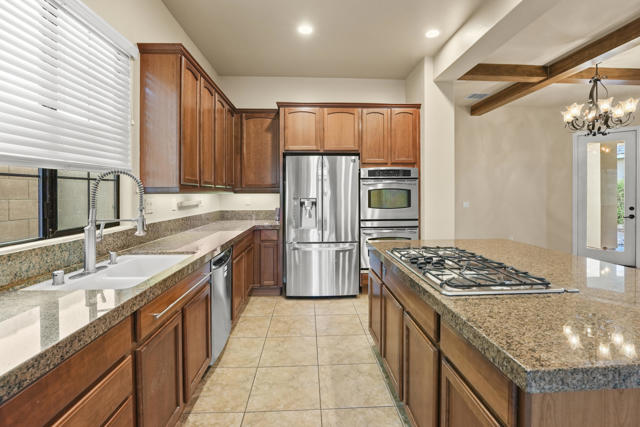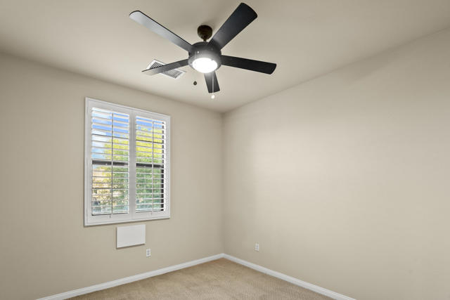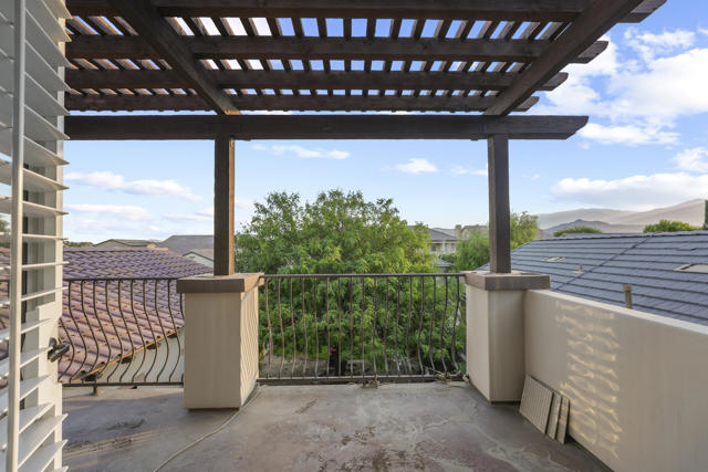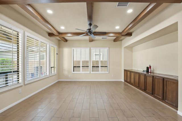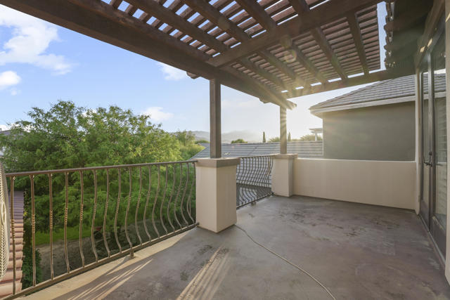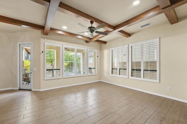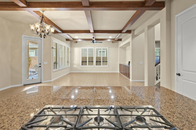 This stunning home offers an open and spacious floor plan with beautiful wood beam ceilings that add warmth and character. The chef's kitchen features a cooktop island, large walk-in pantry, and plenty of space for entertaining. Enjoy fresh new paint, elegant shutters throughout, and a convenient washer and dryer included. The primary suite boasts a private balcony overlooking the backyard; the perfect spot for morning coffee or evening relaxation. Located in a fantastic community offering a resort-style pool, gym, and parks. Just minutes from Rancho Mirage shopping and dining -- but with the value of a Cathedral City address! Experience the best of both worlds in this beautifully maintained home.