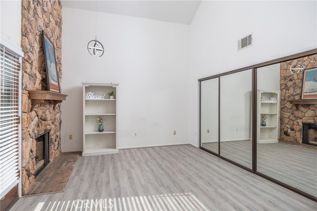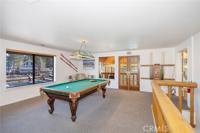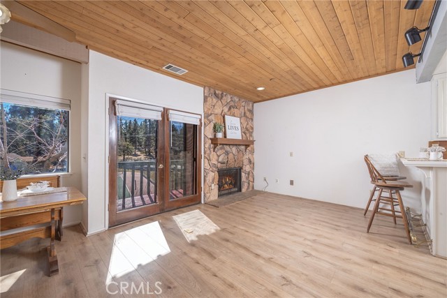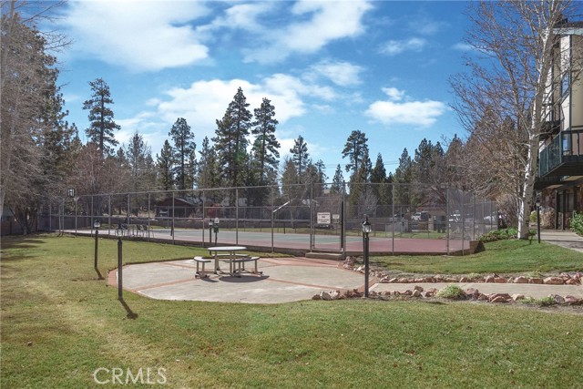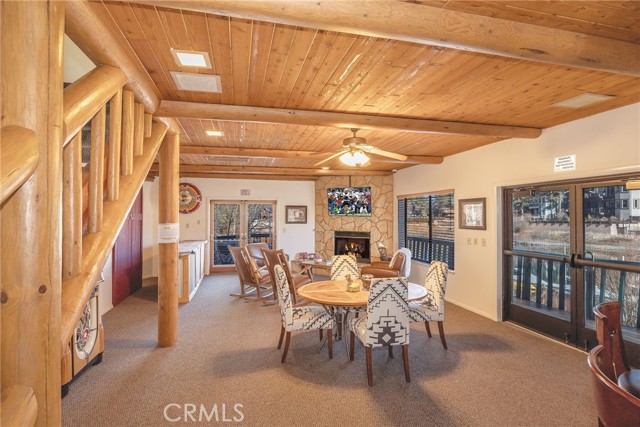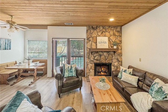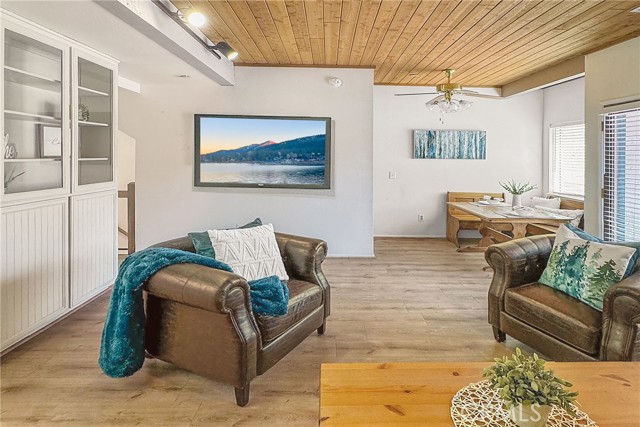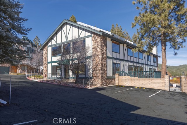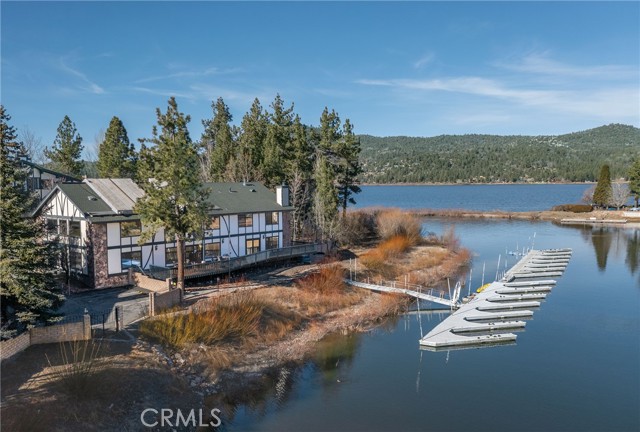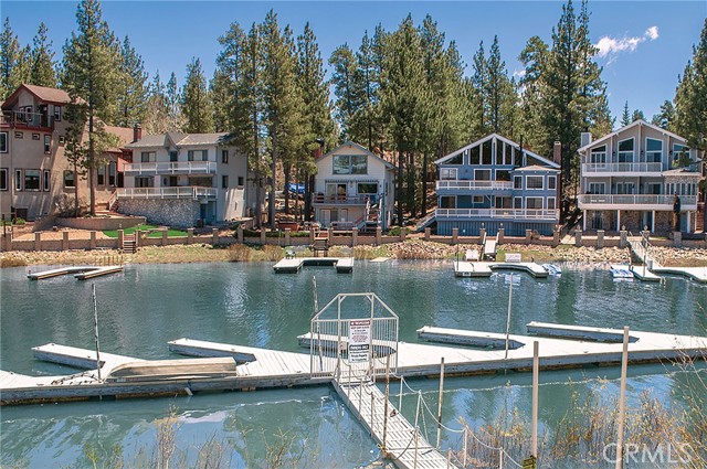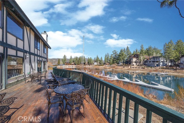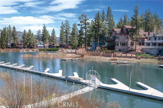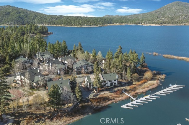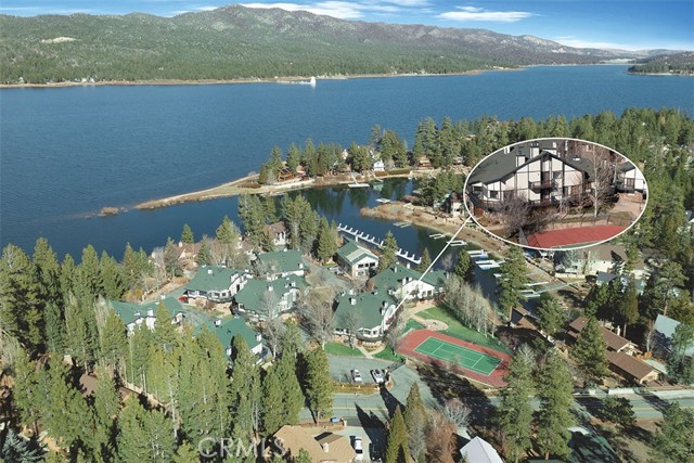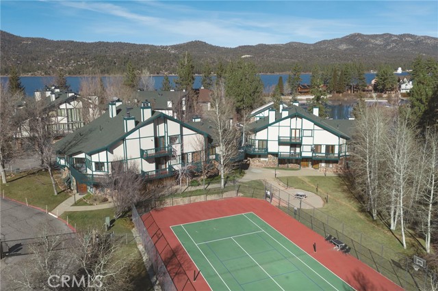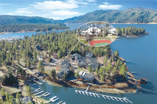 Viking Estates delivers resort-style living at its best featuring great amenities including a dock slip for owners (on a first request basis), lake access to the fun and adventure of the lake & a great clubhouse complex that can be enjoyed in all seasons offering an indoor pool, spa, lakeside sun deck, sauna and locker room, a well-equipped gym & a game room with pool table! Owners may also reserve the lakeside clubhouse for personal gatherings. This south-facing condominium delivers great natural light, updated wood-style flooring & a desirable location that overlooks the tennis-pickleball-basketball area. The open-concept kitchen, living & dining area offers a focal-point fireplace, breakfast bar & French doors opening to one of the homes two sunny decks providing the opportunity to enjoy the outdoors. Featuring 2 en-suite bedrooms + a convenient 1/2 bath, the primary suite boasts soaring vaulted ceilings, a natural gas fireplace, spacious closets, shower/tub, dual-sink vanity & its own deck. There is an in-unit laundry room with washer & dryer included, central heating & an attached single car garage! Offering a rare lakefront-adjacent location with the village shops & restaurants, ski slopes, hiking, mountain biking and many of Big Bear's most popular activities just minutes away! This intimate community is gated for added security. For extra ease, winter snow removal for the interior road & parking areas is handled by the HOA. This unit offers great options as a full-time home or a fantastic personal getaway with the added potential as an income-producing short term rental (STR)!