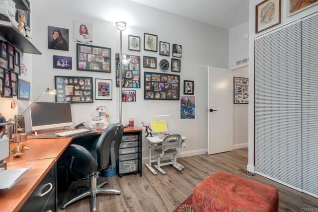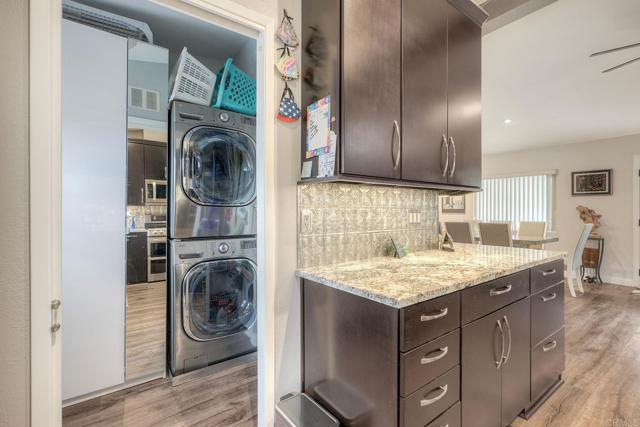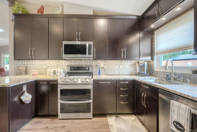 Stunning home beautifully updated! Home offers functionality with a long list of modern enhancements! Wall removed in kitchen to acquire a more open concept*Elegant recessed lighting*brand new kitchen contemporary finishes*granite counters*LED lighting*New flooring for a fresh cohesive look! Bar frig/ wine rack for entertaining* New refrigerator* Energy efficient SOLAR owned*New roof*Murphy bed*Primary remodel bedroom for efficiency*Gorgeous oversized shower with 2 shower heads custom remodeled room extremely efficient* custom front door* new windows with disappearing screens*Sought after west side location *direct access from garage to house*Garage cabinets/shelving *Spacious private yard with natural gas firepit boasting landscape lighting & overhead yard illumination an entertainers dream quiet/private* Own the land, own the house, gated senior community enjoy the ocean breezes!