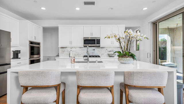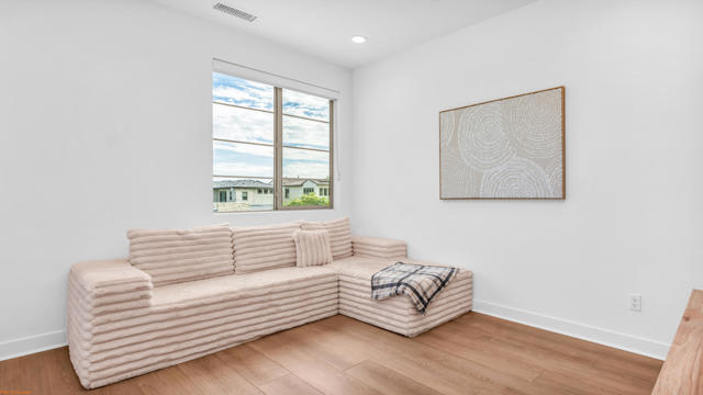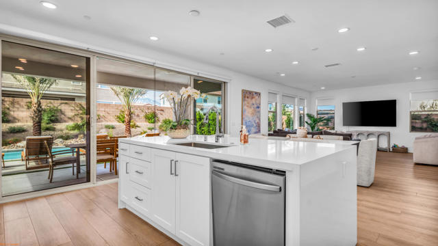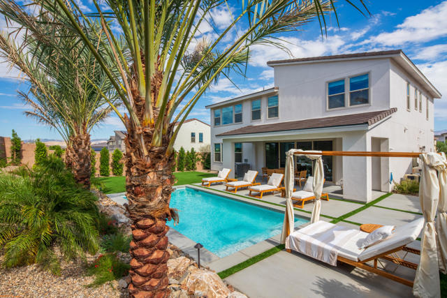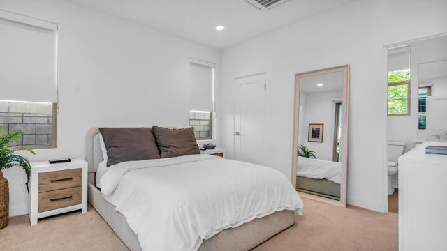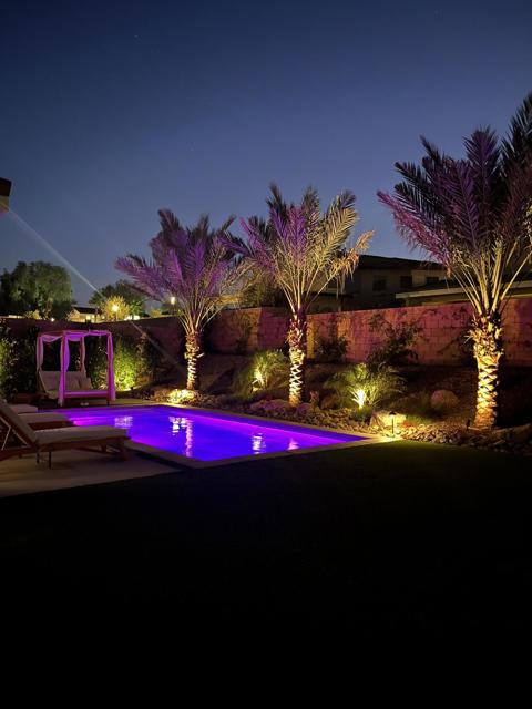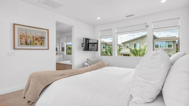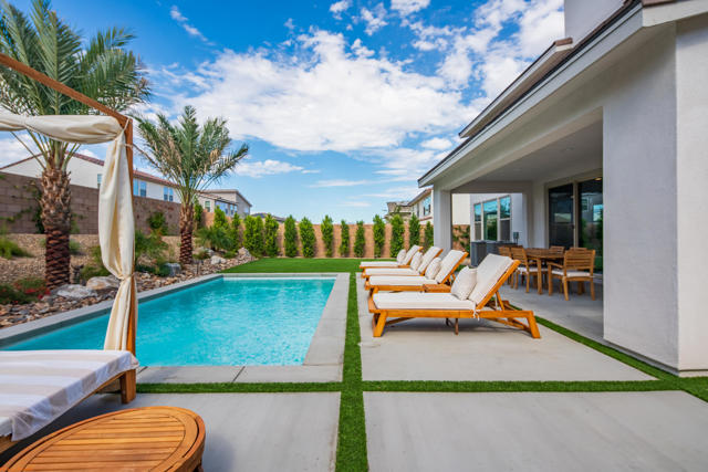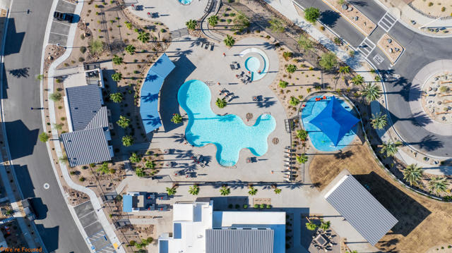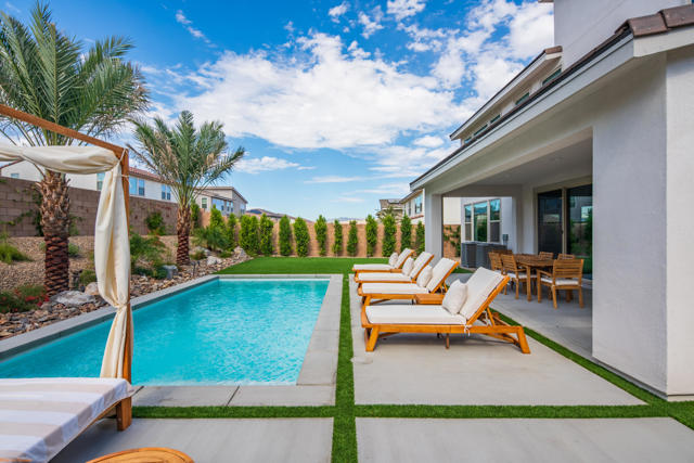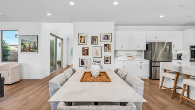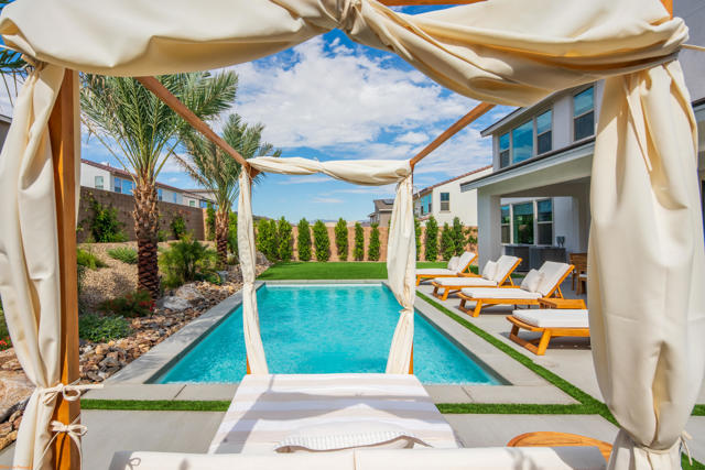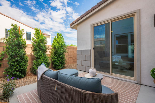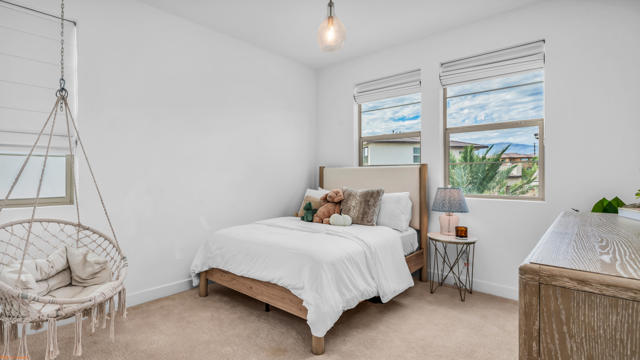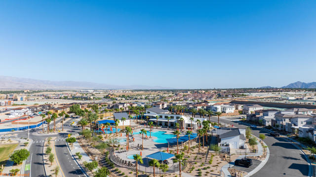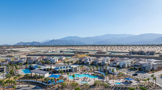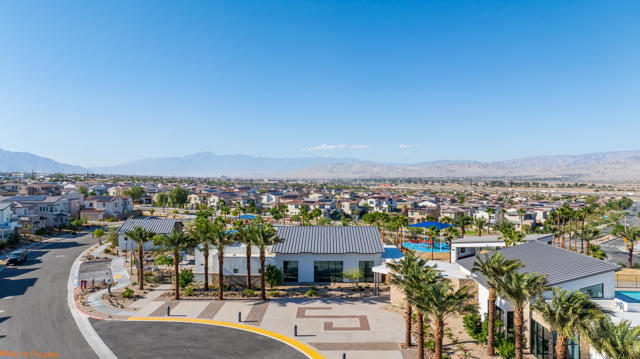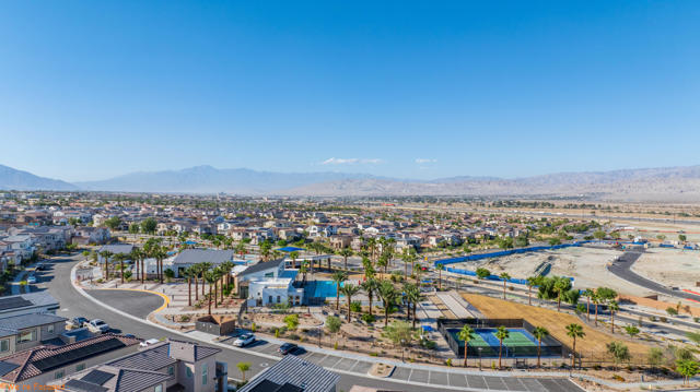 Move right into this stunning upgraded 4-bedroom, 3.5-bath pool home in the new University Park community, completed February 2025. This upgraded residence showcases mountain views, soaring ceilings, and abundant natural light throughout. The open-concept great room seamlessly connects the kitchen, dining, and living areas--perfect for entertaining. The gourmet kitchen features double ovens, a 5-burner cooktop, premium countertops, designer backsplash, and a spacious pantry.Enjoy true indoor-outdoor living with a private central courtyard and covered patio overlooking the large pool, mature landscaping, and custom lighting.Thoughtful layout includes one bedroom and 1.5 baths downstairs, plus three bedrooms, two baths, and a loft upstairs. The primary suite offers a walk-in closet, dual vanities, soaking tub, and large walk-in shower.Additional highlights:Upstairs laundry room with ample storage, Owned solar system for energy savings,Roman shades & scratch-resistant vinyl flooring and Upgraded pebble-finish garage floor.Residents enjoy The Grove, University Park's resort-style amenity center with pools, pickleball courts, a fitness center, event lawn, fire pit, and BBQ area.Experience modern luxury and resort-style living in this move-in ready Palm Desert gem!