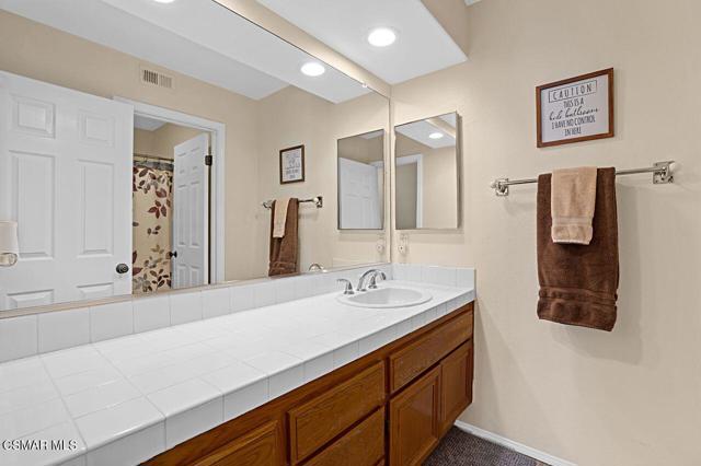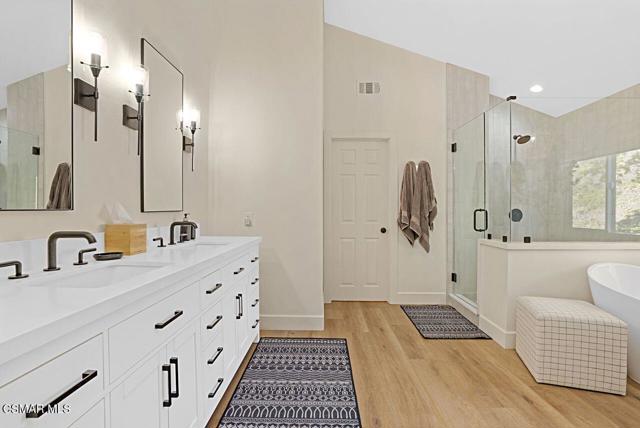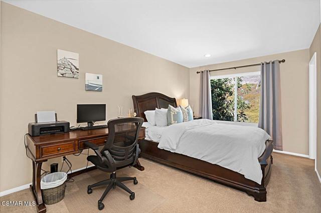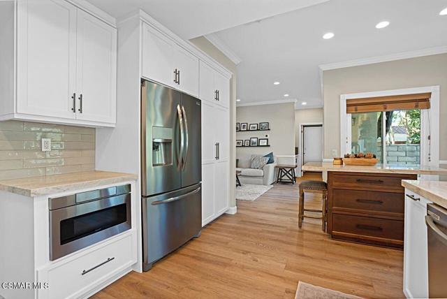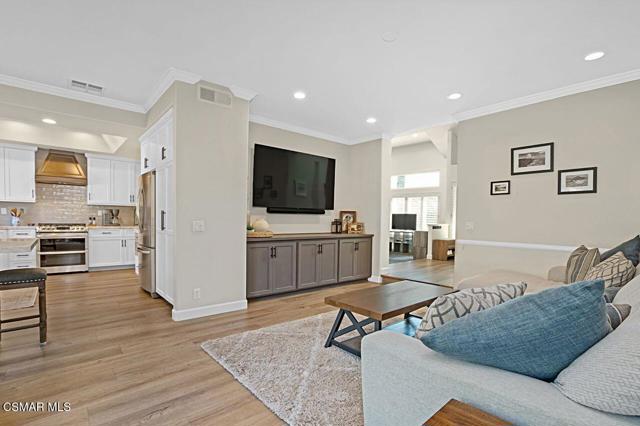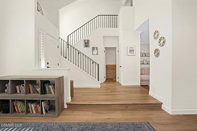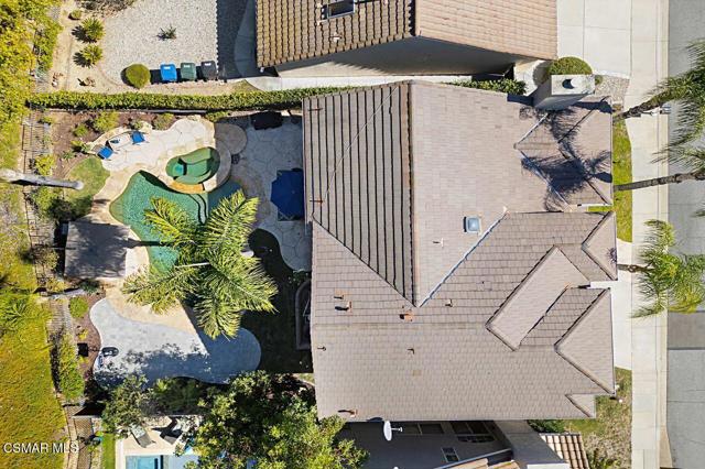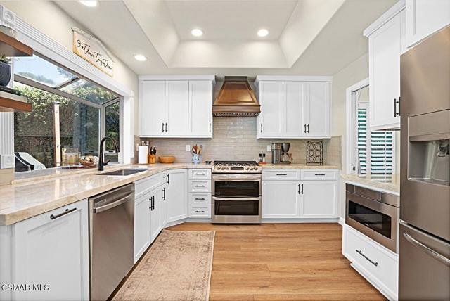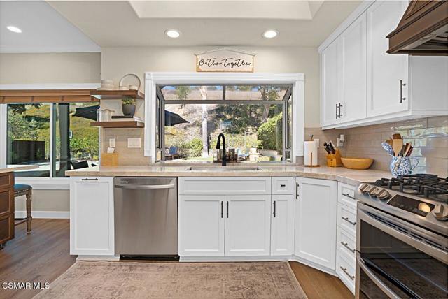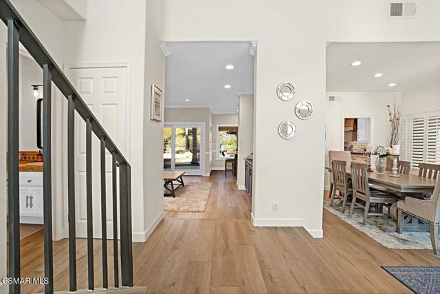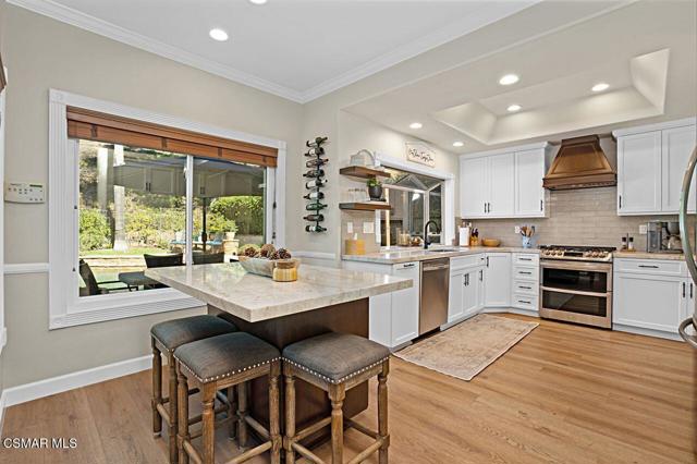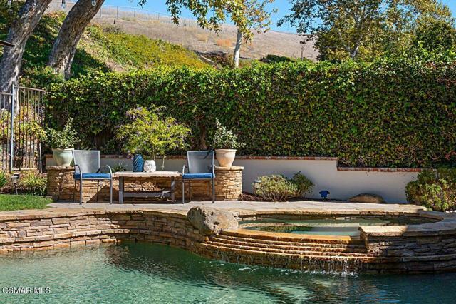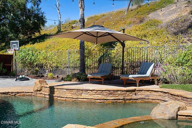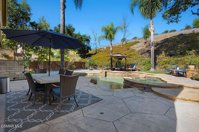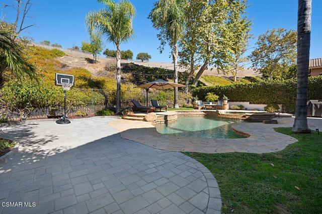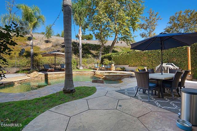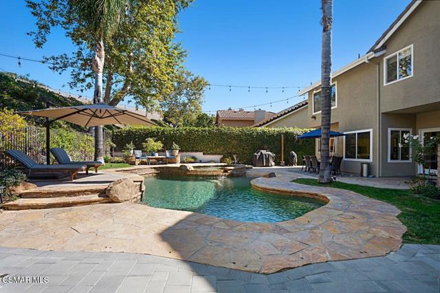 Your Stunning Upgraded Pool Home in Oak Park Awaits! Step through the custom front door into a bright, open foyer with soaring ceilings and beautiful luxury vinyl plank flooring that flows throughout the main level. The elegant formal living room showcases a remodeled fireplace and a sliding glass door leading to the side yard, while the adjacent formal dining room connects to the kitchen through a convenient pocket door. The chef's kitchen, completely remodeled in 2021, is a showstopper--featuring quartz countertops, stainless steel appliances, a custom backsplash, and a designer range hood. Custom cabinetry includes pull-out shelves and soft-close hinges for optimal function and style. A spacious island with a casual dining area overlooks the backyard, creating the perfect setting for family gatherings. The kitchen seamlessly opens to the inviting family room with ample space for relaxation and re-faced cabinetry for a polished look. Off the family room, you'll find a well-appointed laundry room with re-faced cabinets leading to a garage that offers additional storage. A stylish powder room is conveniently located near the foyer. The staircase has been beautifully opened up with a custom iron railing, adding a modern touch to the home's design. Upstairs, the luxurious primary suite impresses with vaulted ceilings, hillside views, and remote-controlled window shades. The remodeled primary bathroom offers a spa-like retreat with a soaking tub, separate shower, dual vanities, and a spacious walk-in closet. A second bedroom suite features its own private bathroom and scenic views, while two additional large bedrooms share a hallway bath. The entertainer's backyard is a true oasis, perfectly positioned on a premium lot backing to open space. Enjoy a beach-entry Pebble Tec pool and spa, lush grassy area, and multiple sitting areas ideal for relaxing or hosting gatherings. Additional highlights include plantation shutters, recessed lighting, a whole house fan, and upgraded windows throughout. Ideally located in the award-winning Oak Park School District, close to shopping, parks, hiking trails, and the community center -- this home truly offers the best of California living.