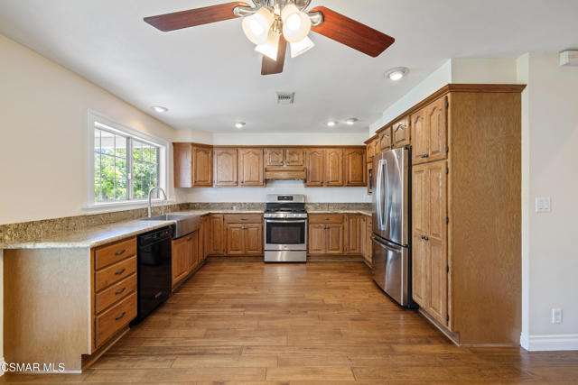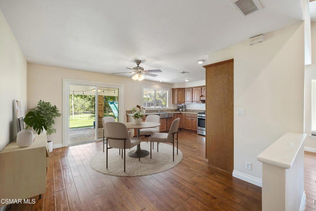 Cottage near the canyon. Owners loved this home and you will too. Nestled up against Wildwood Park with view of creek, abundant wildlife and birds. Just one door away from path that leads through park to Wildwood Elementary School. The rear yard is spacious with a large covered patio, built-in bar counter and barbecue for comfortable outdoor living, Garden and tool shed, raised bed garden, large grass area, fruit trees, dog run with fence, and play set are included.Now the inside, customized living area with partial wall removed to open up the living area, refinished wood beams in living room, smooth ceilings, crimped wiring and new lighting, custom window seats with built-in bookshelves and hidden storage in living room and bedrooms, closet organizers, crown molding in all bedrooms and custom wall panel molding in primary bedroom.. Hall bath has been recently remodeled. Newer oven, sink, roll out shelves, and Lazy Susan system, new carpet in hallway and primary bedroom, all new HVAC system in 2018, new sewer line with clean out added, built-in cabinets and a clean laundry area in garage limits covered parking but can easily be restored. Some photos, including ones with a fire in the fireplace have been virtually staged.