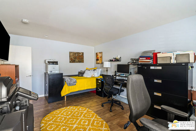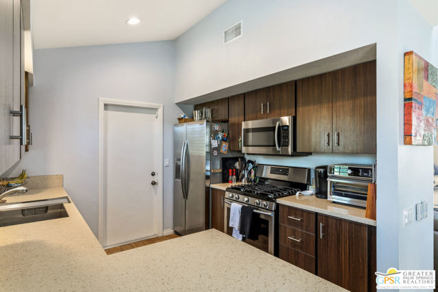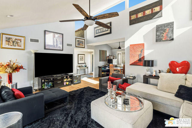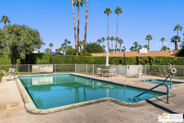 Welcome to your desert sanctuary nestled in the highly sought-after SaddleRock Estates community, one of Palm Springs' most iconic mid-century enclaves in South Palm Springs. This single-level 2-bedroom, 2 bath condominium offers an exceptional blend of architectural character, thoughtful updates, and resort-style living with spacious open-concept living with vaulted ceiling and clerestory windows flooding the interior with natural light, all just steps from Smoke Tree Commons, boutique shopping, cafes, and scenic hiking trails. Sliding glass doors open to the private patio from the living room and primary bedroom with views of the San Jacinto mountains. Attached two-car garage. SaddleRock Estates, designed by architectural master Hugh Kaptur, is a boutique gated community with just 24 homes, making every resale a rare opportunity. New land lease extension to 2077 is available. Contact LA for details. 24 hours required for all showings.