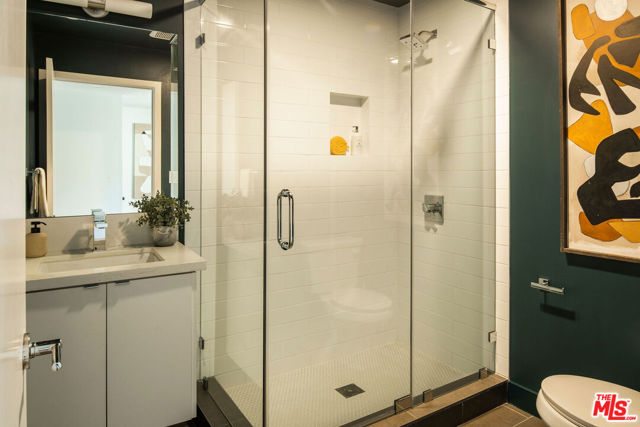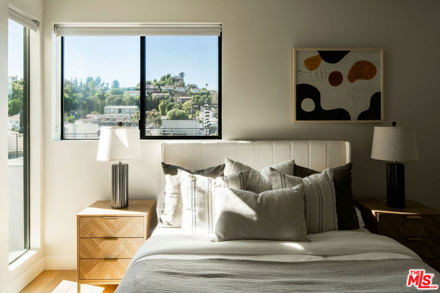Perched within The Cliffs, a boutique collection of modern architectural homes in Echo Park, this light-filled 2-bed, 3-bath residence blends elevated design with stylish upgrades across four thoughtfully designed levels. Sunlight floods the interiors, highlighting warm wood flooring and a seamless open-concept layout. The gourmet kitchen is a true centerpiece, appointed with handcrafted Moroccan Zellige tile, an expansive quartz island, and professional-grade Fisher & Paykel and Bosch appliances. Just beyond the dining area, a private terrace with handmade Mexican Cotto terracotta tiles extends the living space outdoors. The second level hosts two serene bedroom suites, each finished with Farrow & Ball floor-to-ceiling paint for a bespoke, gallery-like aesthetic. The primary suite indulges with a spa-inspired bathroom, showcasing double vanities, a soaking tub, and a walk-in shower, evoking a boutique hotel experience. A brand-new LG washer and dryer provide seamless convenience. Crowning the home is a private rooftop retreat with a Brazilian walnut IPE deck, gas hookup, and panoramic city views, an ideal setting for entertaining under the stars. The lower level offers a direct-access two-car garage equipped with MyQ remote technology, a versatile bonus/office space with polished concrete floors, Farrow & Ball floor-to-ceiling paint, and a statement powder room adorned with Farrow & Ball hand-painted wallpaper. With modern architecture, thoughtfully curated upgrades, and enviable outdoor spaces, this home offers a turnkey opportunity to live stylishly in the heart of Echo Park, one of Los Angeles' most sought-after enclaves.