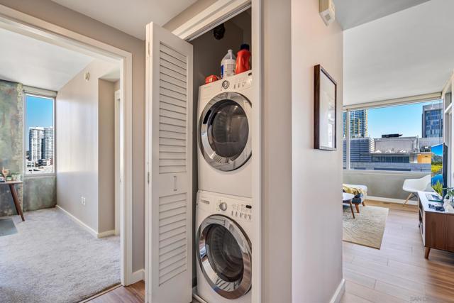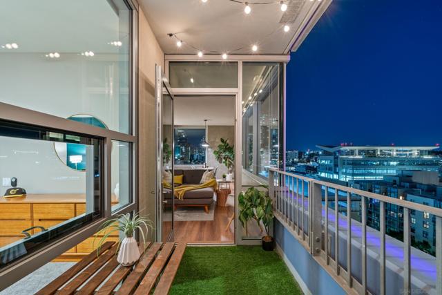 Experience elevated downtown living at ICON, where modern design meets timeless sophistication. This meticulously maintained and upgraded northeast corner residence showcases breathtaking panoramic views of the San Diego Bay, Coronado Bridge, and the sparkling city skyline. Step through the entryway into a light-filled, open-concept floor plan featuring new carpet, wood-look flooring, and fresh designer paint throughout. The gourmet kitchen impresses with stainless steel appliances, sleek granite countertops, and ample cabinetry—perfect for both casual dining and entertaining. The serene primary suite includes a fully built-out closet and a beautifully finished bath with dual vanities. Modern urban comforts include in-unit laundry, two parking spaces, and a private storage unit, providing both convenience and functionality to your downtown lifestyle. ICON is a VA-approved community offering resort-style amenities such as a 24-hour front desk attendant, state-of-the-art fitness center, and the iconic rooftop Skybox terrace with lounge seating, TVs, surround sound, BBQs, heaters, and panoramic city views. Additional amenities include the 5th Inning community recreation room with a full kitchen and business center, a private movie theater, community fireplace, bike and package storage with Amazon lockers, and an interior courtyard featuring sculptural art, a waterfall element, and modern landscaping. Residents also enjoy Google Fiber high-speed internet, on-site property management, and a sleek, contemporary lobby entrance. ICON is a VA-approved community offering resort-style amenities such as a 24-hour front desk attendant, state-of-the-art fitness center, and the iconic rooftop Skybox terrace with lounge seating, TVs, surround sound, BBQs, heaters, and panoramic city views. Additional amenities include the 5th Inning community recreation room with a full kitchen and business center, a private movie theater, community fireplace, bike and package storage with Amazon lockers, and an interior courtyard featuring sculptural art, a waterfall element, and modern landscaping. Residents also enjoy Google Fiber high-speed internet, on-site property management, and a sleek, contemporary lobby entrance. Explore the best of downtown living—just moments from Petco Park, Gallagher Square, the historic Gaslamp Quarter’s shops and dining, the Central Library, convenient trolley and bus lines, FIT Athletic Club, the Harbor Drive Pedestrian Bridge leading to The Rady Shell, the Convention Center, Seaport Village, Embarcadero Parks, the Coronado Ferry, and more. This home offers the perfect balance of sophistication and vibrant urban energy.