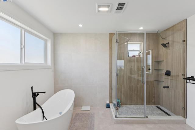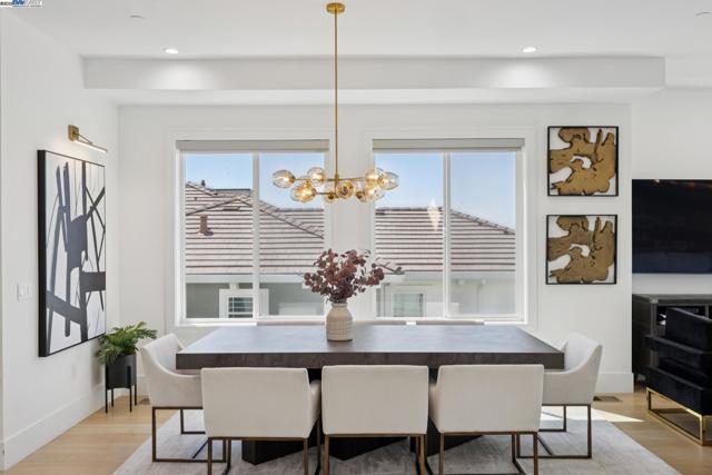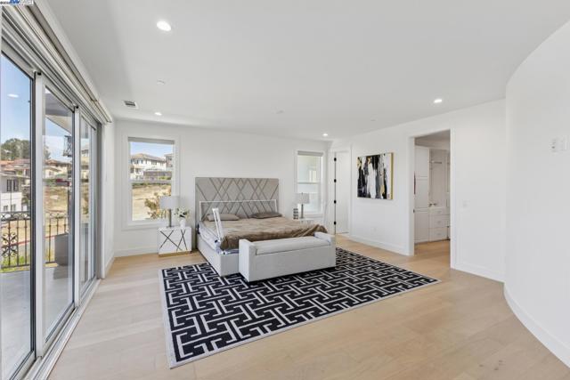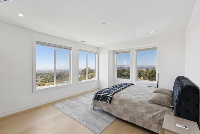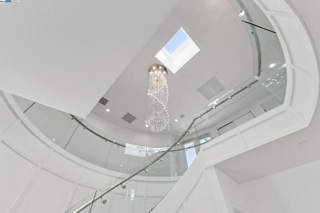 Stunning custom-built home in an exclusive gated community in the Fairview District with breathtaking Bay and SF skyline views. This 4-bedroom, 4-bathroom residence offers luxurious living with all ensuite bedrooms featuring walk-in closets. Step through the grand double doors into a soaring entry with a circular glass staircase and a custom chandelier. The open-concept layout features rich hardwood floors throughout, two full kitchens, including a prep kitchen, and two laundry rooms one on each level for added convenience. The main kitchen features premium appliances, quartz countertops, and modern finishes. Multiple view decks and large windows showcase panoramic vistas. The primary suite offers a spa-like bath with a soaking tub, walk-in shower, dual vanity, and custom tilework. Additional highlights include a paid-off solar system, EV charger, whole-house ventilation system, and beautifully landscaped outdoor spaces. A rare opportunity to own a showstopping home with privacy, functionality, and views in the Bay Area.