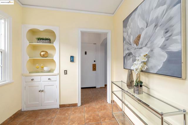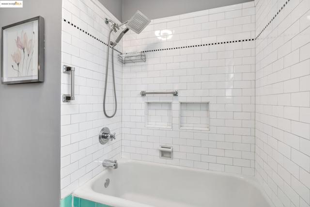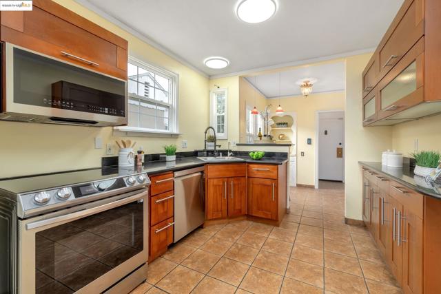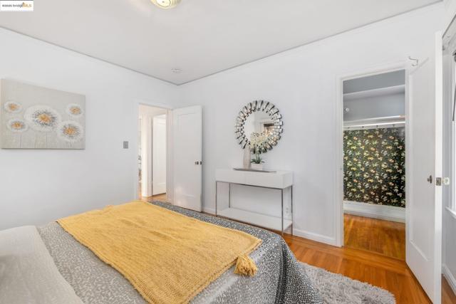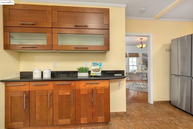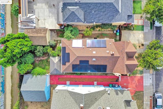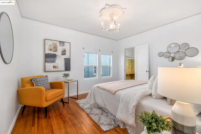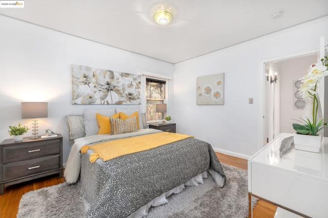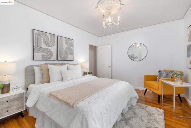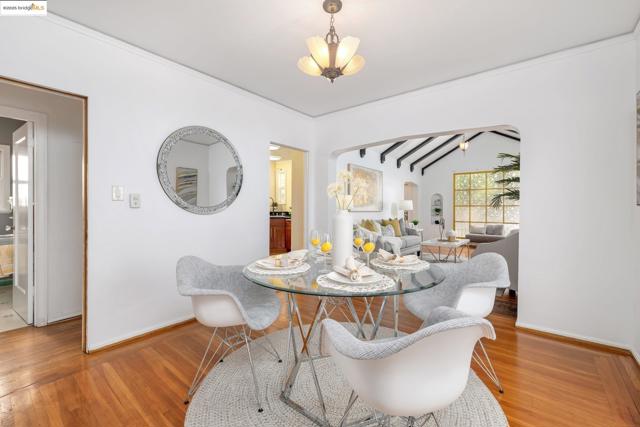 Step into storybook charm in this 1929 Tudor bursting with character and modern upgrades. Behind its cheerful stucco exterior and arched entry lies a warm, light-filled home with refinished hardwood floors, a cozy living room with vaulted beamed ceiling, and a sunny dining area that flows into an updated eat-in kitchen. The kitchen features stainless appliances, and a charming breakfast nook perfect for morning coffee. Two comfortable bedrooms and a refreshed bath create a thoughtful layout all on one level. Energy-saving owned solar panels and forced-air heat add comfort and efficiency. Outside, enjoy a fenced backyard ideal for entertaining, gardening, or relaxing under the California sun. The detached garage and off-street parking provide convenience and extra storage. Located just minutes from BART, shopping, and freeway access, this enchanting Tudor blends vintage character with modern livability in the heart of Oakland.