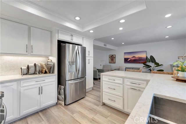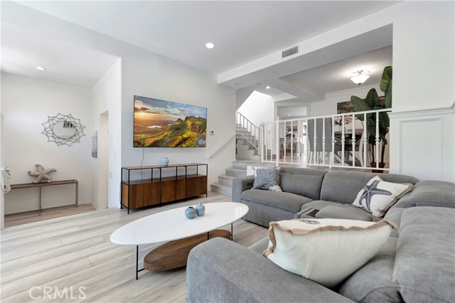 Extremely light & bright ocean-close home in a fabulous interior location facing a serene greenbelt in SeaCliff on the Greens - the exclusive 24-hour guard gated community that is a 5-minute walk to the beach and across the street from the wetlands! Upgrades include recessed lighting, upgraded hard surface flooring, brand new AC, custom paint, custom light fixtures, plantation shutters, updated windows and sliders and so much more. The living room showcases a floor-to-ceiling stone fireplace and custom windows & slider. Just off the kitchen, a cozy family room with a built-in desk opens to a partially enclosed balcony for added space, and another balcony next to the kitchen is perfect for your BBQ setup. Gourmet kitchen with stunning waterfall quartz counters, white shaker cabinets, breakfast bar, and stainless steel appliances. Grand primary suite with vaulted ceilings, dual walk-in closets with organizers & view balcony. The primary bath has been tastefully remodeled with shaker cabinets, quartz counters, dual sinks, a spa tub, and a walk-in shower. Ample size secondary bedrooms and conveniently located upstairs laundry area. Direct garage access with tons of storage. Beautiful sunny front patio with newly installed pavers facing the greenbelt. 2-minute walk to several community pools, spas, and clubhouse. Steps to the beach, the trails at the Bolsa Chica Wetlands and fabulous parks. Award-winning SeaCliff Elementary School. A truly unique community!