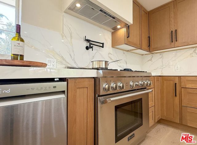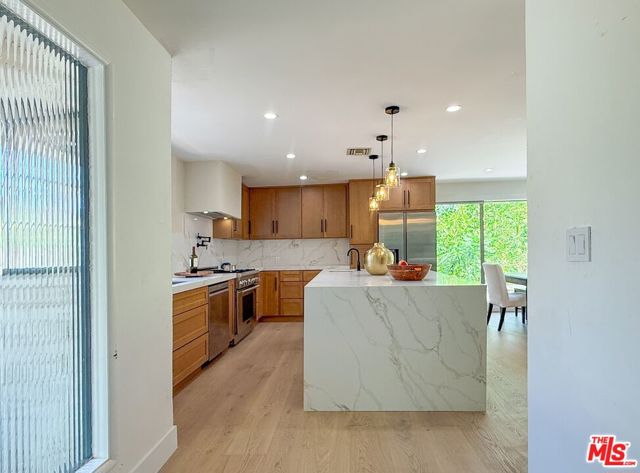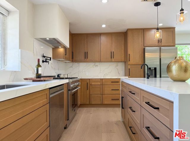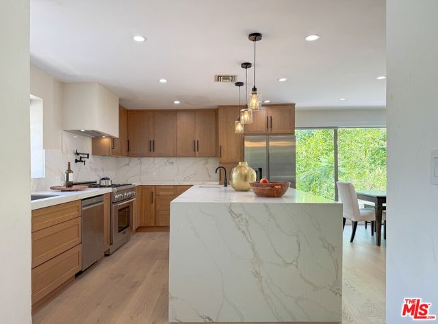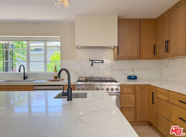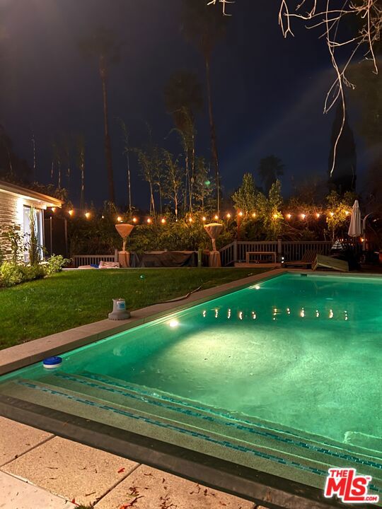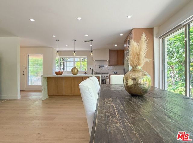 Tucked at the end of a quiet cul-de-sac in prime Sherman Oaks, this single-story 3BR/2.5BA (~2,109 sf) blends style, privacy, and effortless indoor-outdoor living. A clean modern palette wide-plank oak floors, recessed lighting, Roman Clay walls frames a chef's kitchen with a 7'x5' waterfall island, prep sink, pot filler, and 36" Thermador range. The sun-drenched primary suite opens to a lush yard with a 40' heated lap pool (10' deep), sun decks, grassy play area, and golden-hour valley views. A third bedroom with en-suite bath is perfect for guests or a luxe home office. Extras: brand-new 15-panel solar (lower utilities), outdoor loungers + heaters, and unbeatable proximity to Ventura Blvd favorites, Equinox, and Fashion Square Mall. Available fully furnished and turnkey. Flexible lease terms (short, mid, or long). This is elevated Sherman Oaks living private, polished, and ready now.