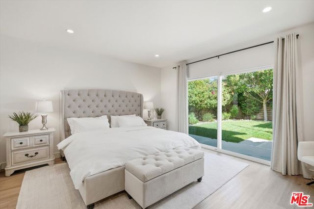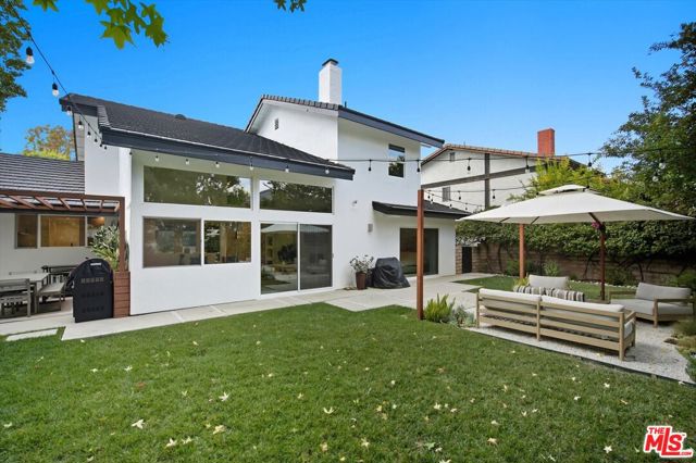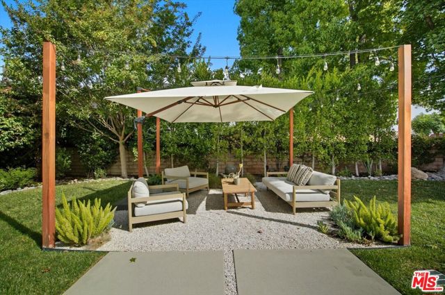 Positioned on a corner lot in the coveted Village Homes neighborhood, this reimagined 4-bedroom, 3.5-bath residence perfectly balances modern design with California comfort. Blending clean, contemporary lines with mid-century warmth, every inch of this home has been thoughtfully curated to create a seamless indoor-outdoor flow ideal for both everyday living and entertaining. Step through the dramatic walnut front door into an airy, open-concept main level where natural light pours through floor to ceiling windows and doors, illuminating the designer finishes throughout. The kitchen, dining, and living spaces connect effortlessly anchored by a sculptural floor-to-ceiling clay tile fireplace and custom white oak staircase crowned with an 18-foot handcrafted chandelier. Sleek custom cabinetry, floating wood shelves with under-lighting, and stainless steel appliances lend the kitchen a timeless yet modern edge, while the powder bath offers a bold, moody counterpoint with reclaimed wood, smoked mirrors, and designer fixtures. Two primary suites one conveniently located on the main level and another upstairs offer flexibility for multi-generational living or a luxurious guest retreat. Each suite features spa-like bathrooms with bespoke tile work, double vanities, and spacious walk-in showers. Two additional upstairs bedrooms share a beautifully appointed Jack-and-Jill bath. Outdoors, the backyard has been transformed into a serene private retreat designed for relaxation and entertaining. A new pergola shades the dining area and BBQ, while stone hardscaping, expanded planters, and a tranquil fountain set the tone for quiet evenings under the string lights. The cozy seating area complete with umbrella and lush greenery makes this the perfect setting for wine nights, dinner parties, or peaceful afternoons in the sun. The side yards have been refreshed with stone pathways, offering a clean, cohesive aesthetic from every angle. Located just moments from Westlake's shops, dining, and scenic walking trails, and within the highly sought-after Village Homes community featuring a pool, kiddie pool, tennis courts, and clubhouse. This home is the complete package: modern sophistication, functional design, and the effortless Westlake Village lifestyle.