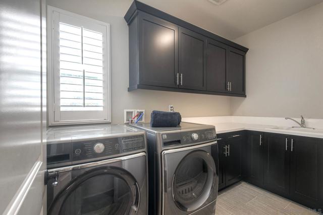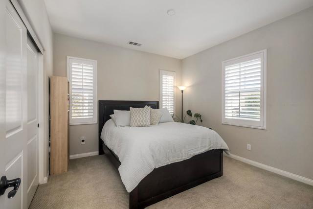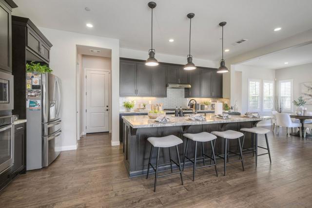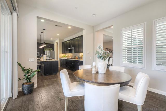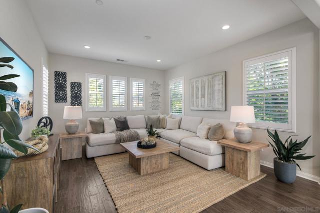 Welcome home! This beautifully designed home in Del Sur community offers an inviting blend of open-concept living and timeless style. The heart of the home is the stunning kitchen, complete with granite countertops, ample cabinetry, and a large island that flows effortlessly into the living room with custom built-ins and engineered hardwood floors. A spacious formal dining room sets the stage for memorable gatherings—and just beyond, an outdoor dining space creates seamless indoor-outdoor living, perfect for San Diego evenings. A convenient main-floor bedroom and full bath add flexibility for guests or multigenerational living. Step inside to appreciate the soaring 10-foot ceilings on the main level and 9-foot ceilings upstairs, creating a bright and airy feel throughout. The upper level includes a versatile loft, a generous primary suite retreat with a spa-inspired ensuite, and an additional bedroom featuring its own private bath. Set on one of the largest lots in the community, the backyard is designed for effortless entertaining and everyday relaxation. With owned solar for energy efficiency and a prime location within highly rated school districts—close to parks, shopping, dining, and freeway access—this home perfectly balances style, space, and convenience.