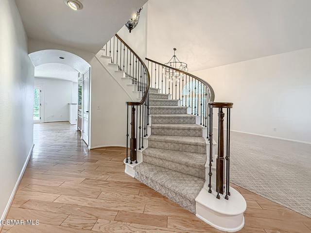 Porter Ranch Executive Home with Breathtaking Views!Welcome to this stunning executive residence in the prestigious, guard-gated community of Porter Ranch. Offering unparalleled mountain and city light views, this elegant estate combines timeless sophistication with modern comfort and resort-style amenities.Step inside through a custom iron double-door entry into a dramatic foyer with soaring vaulted ceilings, gleaming wood floors, and a striking spiral staircase. The formal living room seamlessly flows into the dining area, creating the perfect setting for entertaining.The spacious kitchen has been refreshed with granite countertops, premium stainless steel appliances, and abundant cabinetry, complemented by a charming breakfast nook that opens to the inviting family room. The family room has been beautifully updated, featuring a marble fireplace, new finishes, and a warm, welcoming ambiance--ideal for relaxing or hosting gatherings.The home also boasts newly remodeled bathrooms that exude modern elegance with upgraded fixtures and stylish design details.Double-pane French doors lead to a serene backyard retreat with an oversized covered patio, mature landscaping, and a fruit-bearing lemon tree--all framed by breathtaking mountain and city light vistas.A downstairs bedroom with an adjacent three-quarter bath offers versatility for guests or a home office, while the laundry room with a sink adds everyday convenience. Upstairs, the luxurious primary suite features high ceilings, dual walk-in closets, and a private balcony with panoramic sunset views. The spa-like ensuite includes a jetted soaking tub, separate shower, and dual sinks.A spacious bonus room with its own fireplace and custom built-ins provides endless options for a media room, office, or playroom.Additional highlights include:Finished garage with epoxy floors, insulated walls, and a Level 2 EV chargerDouble-pane windows throughout for comfort and energy efficiencyCommunity amenities are second to none, featuring two sparkling pools, tennis and basketball courts, a sand volleyball court, multiple playgrounds, and lush park-like greenbelts.Ideally located minutes from The Vineyards shopping center, award-winning schools, top dining, scenic hiking trails, and the 118 Freeway.This Porter Ranch home is a rare opportunity to enjoy luxury living with unmatched views and world-class amenities.Renter is responsible for water, gas, and electric. Gated security, community pool, and tennis access included in rent.