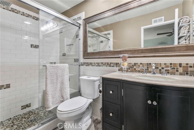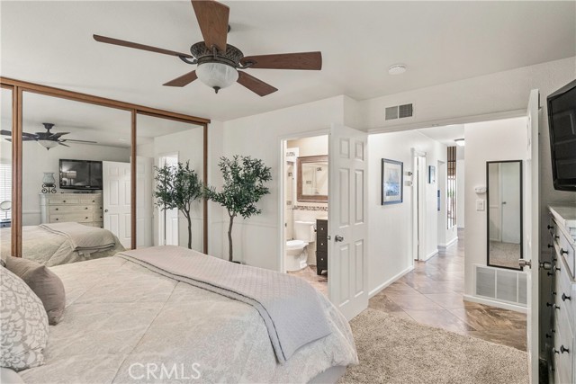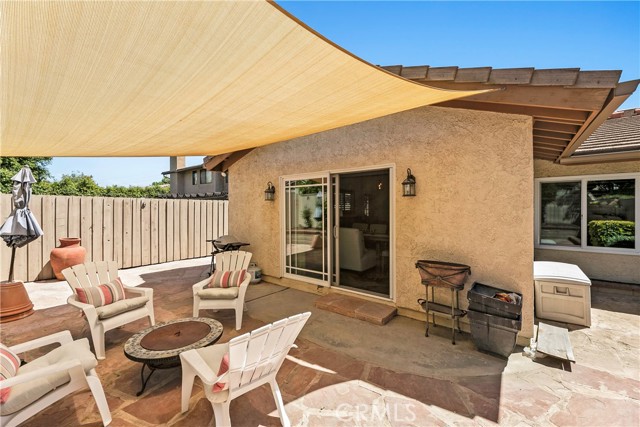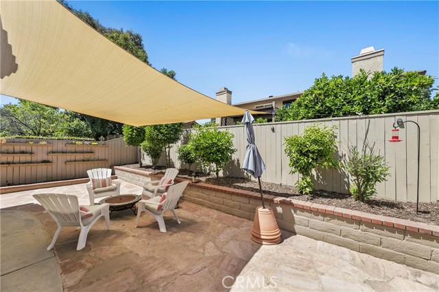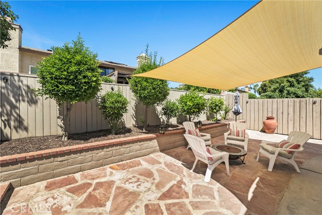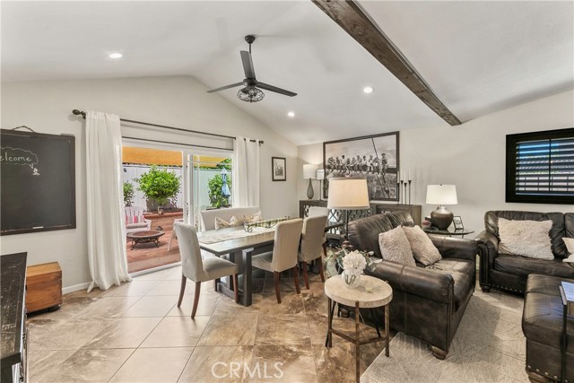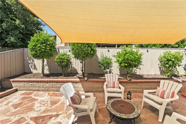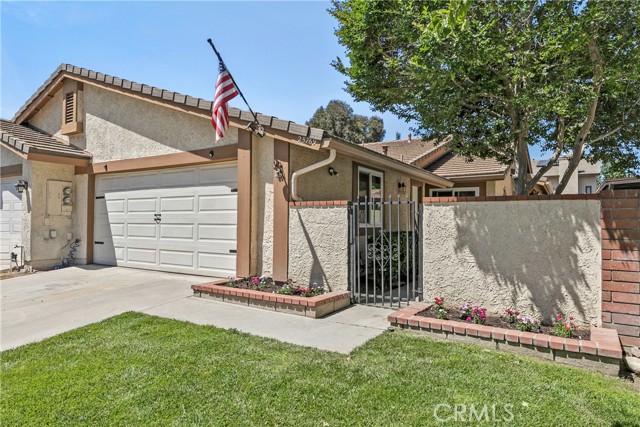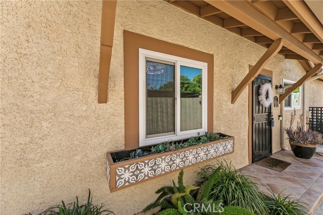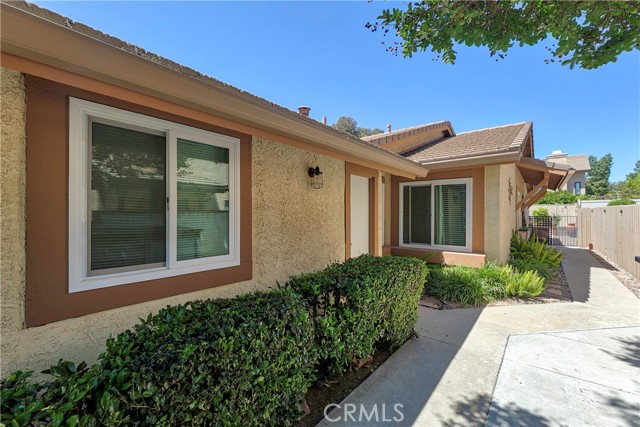 AS LARGE AS THE TWO-STORY SUNRISE FLOORPLAN, YET ON ONE FLOOR!! This stunning, fully remodeled home located in the heart of Valencia. Expanded 3 bedroom, 2 bath home with 1344 square feet has been reconfigured to create a large open floor plan great for entertaining. Entering the home, you are greeted the nice size living room and large dining room with vaulted ceiling and 10-foot sling glass door with leads to the rear yard. Recessed lighting, beamed ceiling, shutters and custom ceiling fan add lots of charm to the living space. Kitchen has newer and some new appliances like the brand-new microwave and trash compactor. Kitchen also features stainless steel sink, pull down faucet, stunning tile back plash and granite countertops. There is built-in coffee bar in the hallway which extends the kitchen area and adds extra cabinets. Dining area off the kitchen features a designer mud brick accent wall with custom floating shelves. Beautiful tile flooring throughout living area. Spacious primary bedroom with decorator wallpaper, ceiling fan and mirrored closet doors. Main bath features, tiled shower, frameless glass shower door, custom vanity and sink, large framed mirror and attractive light fixture. The hall bath also has beautiful tiled features, framed mirrored, vanity, newer toilet and fixtures. There are 2 additional good size bedrooms. Sliding doors lead to a covered backyard patio surrounded by brick trimmed planters with citrus trees and flowers. 2 car attached garage with direct access into the home. For added storage there is a pull-down access ladder to the attic. Home has newer windows. Entering the gated courtyard, you are greeted with a beautiful Crepe Myrtle tree. The courtyard walk way leads to the front porch area and wraps around to the rear covered patio which is wonderful for relaxing. . There is access at the end of the street provides endless walking paths. With 3 pools, parks, Paseo shopping and restaurants just a short walk away you can truly enjoy everything Valencia has to offer. There are NO Mello Roos fees and the HOA is VERY, VERY low.